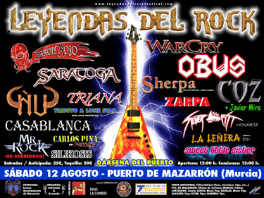 El cartel quedó cerrado hace meses. Las bandas que tocarán en el festival LEYENDAS DEL ROCK son: BARÓN ROJO, SARATOGA, WARCRY, SHERPA, OBÚS, ÑU, SILVER FIST, TRIANA, COZ, Carlos Pina (ex-PANZER) + CASABLANCA, SILIKOSIS (S.K.S.), ZARPA, LA LEÑERA, MR. ROCK, TRIBUTO A LONE STAR y SWEET LITTLE SISTER.