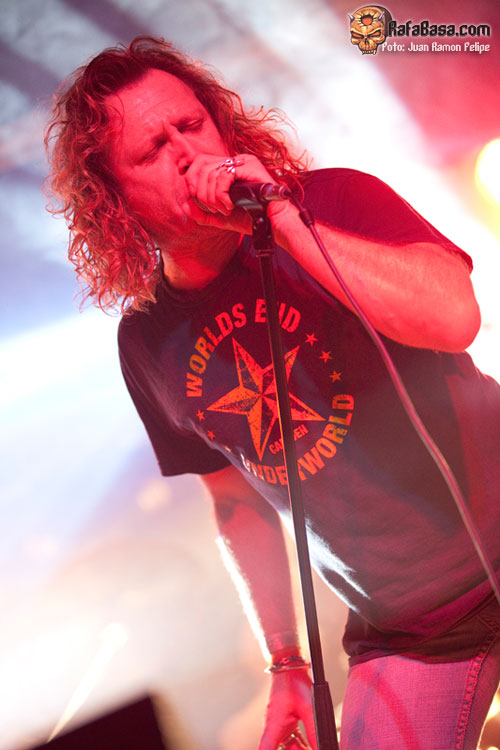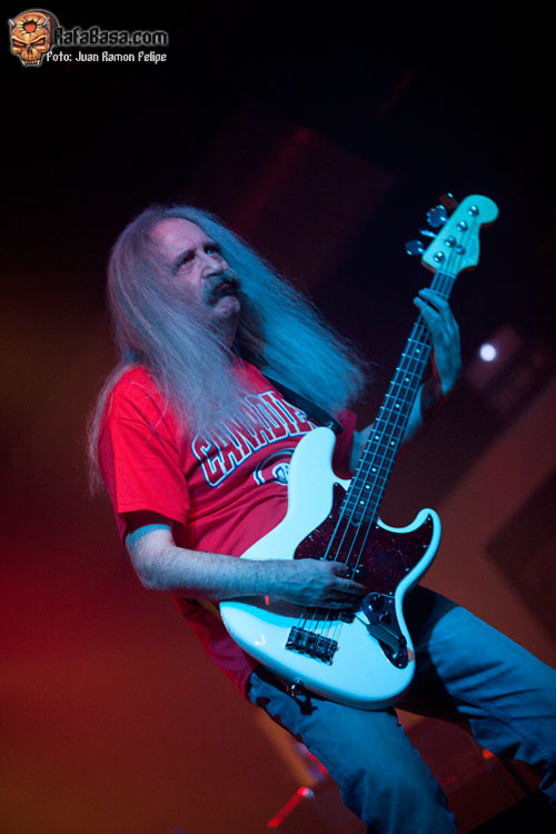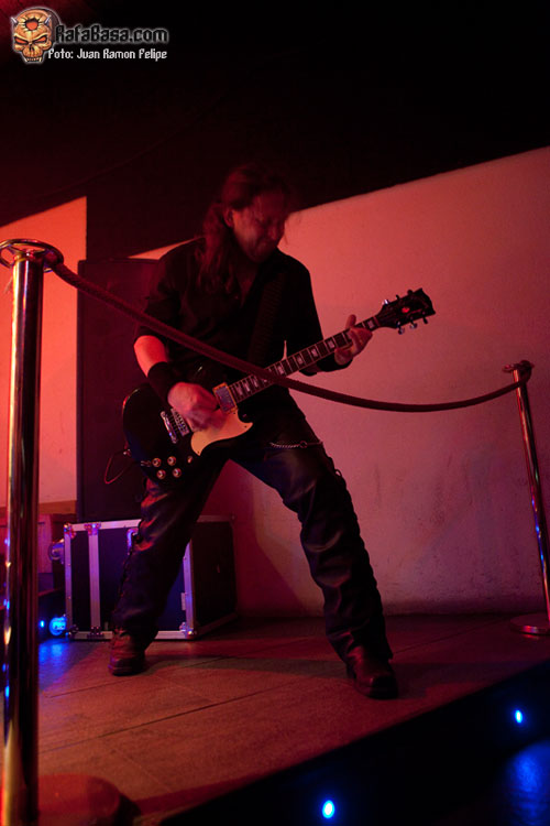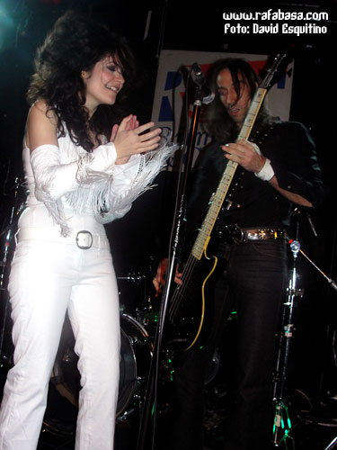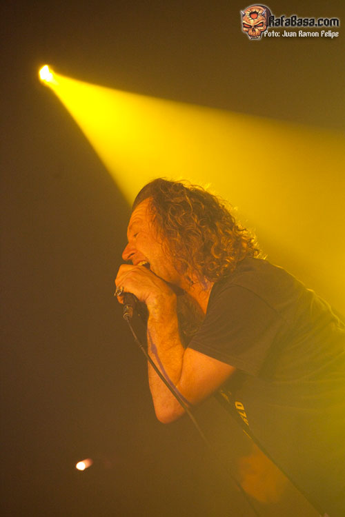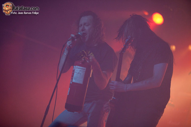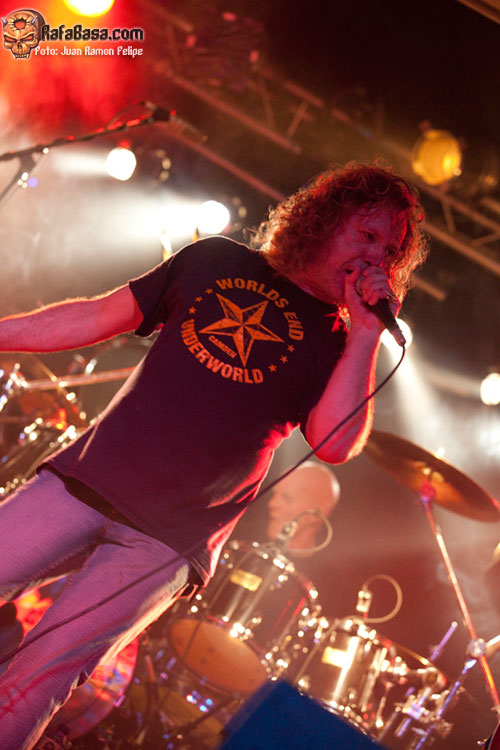 Bueno, pero no me adelanto, que aún no he hablado de los teloneros, unos SABBATH CADABRA que me gustaron mucho, una joven banda madrileña de tributo a los primeros BLACK SABBATH que la verdad es que dejaron muy buen sabor de boca en los apenas 40 minutos que estuvieron en escena. Comentar que presentaban a su nuevo guitarrista, Iván (ex NANCY HOLE), al que vi muy suelto y seguro en la banda, y que llevan cantante femenina, Verónica, que se metió de lujo en el papel del Ozzy más setentero imitándole de maravilla en movimientos (con esos saltos de rana y las palmadas inconfundibles) e incluso en vestimenta, completamente de blanco y con flecos en las mangas, como podíamos ver al "madman" en los vídeos de la época. Y aunque fuera cosa de la sala, destacar el estupendo juego de luces con el que contaron ambientando de maravilla la actuación a este respecto.