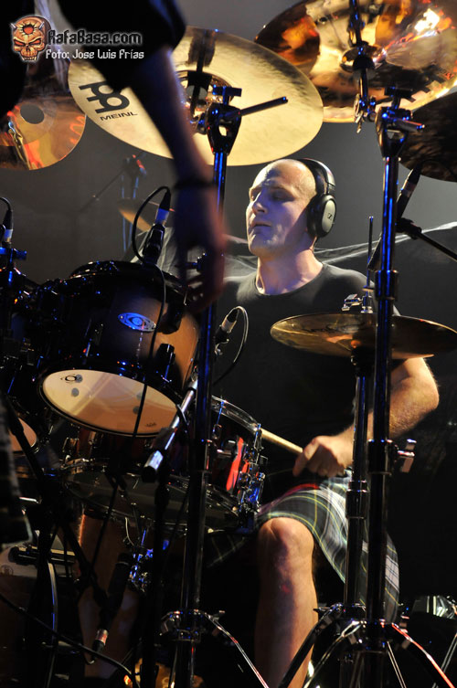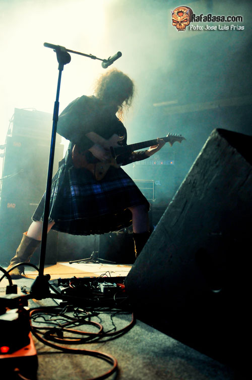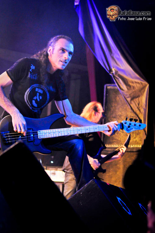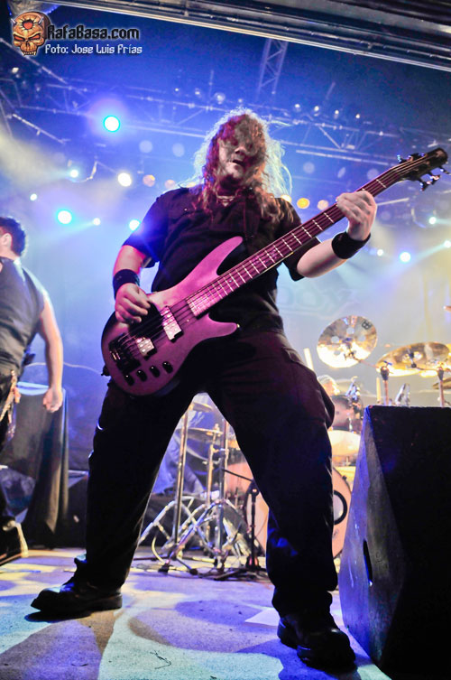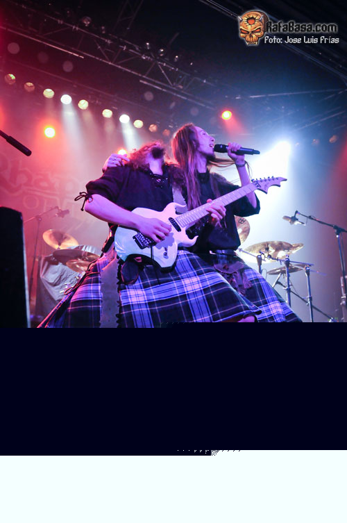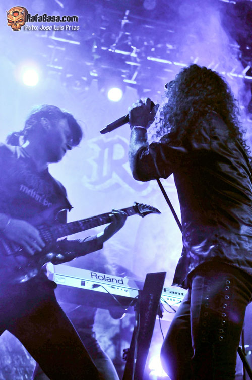 Con las luces apagadas y el público entregado desde el primer momento, los músicos iban saliendo de las sombras ante la imponente voz de Sir Cristopher Lee para hacer un repaso generoso y equitativo a todas sus épocas en hora y media que no se hizo corta ni larga. "Triumph or Agony" abría la caja de los truenos en todo su esplendor, seguida de la majestuosa "Knightrider of Doom" y "The Village of Dwarves" que nos puso a botar a todos con su alegre melodía, tras la que vino la primera gran ovación de los asistentes. "Unholy Warcry" fue recibida como todo un himno, con todos coreando la melodía principal del comienzo, "Guardiani del Destino" fue un pequeño y hermoso respiro antes de la felizmente rescatada de su primer álbum "Land of Inmortals", haciéndonos alucinar con el doble solo de Luca y Dominique, el primero con arpegios y el segundo a la melodía; sencillamente alucinante.