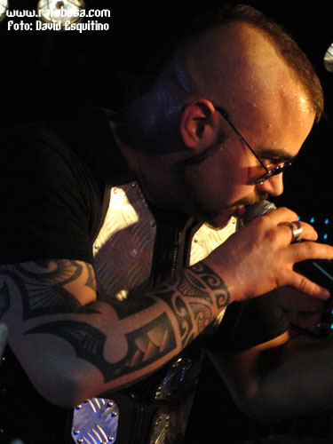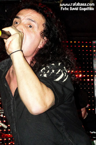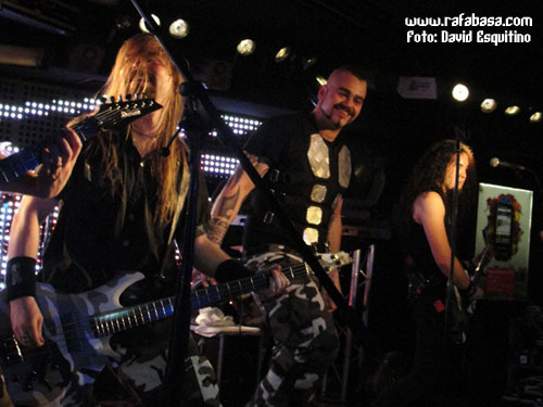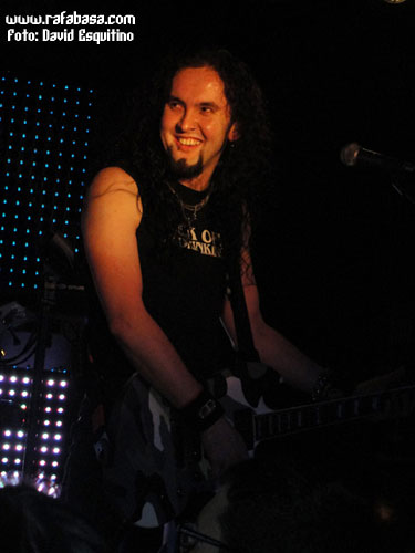 NIGHTMARE –> ¡Sorpresón! No había oido nada de ellos, de hecho tan sólo sabía que eran franceses, sorprendentemente «viejunos» y que hacían Power Metal. Más o menos sobre la tercera canción, y disfrutando mucho de su show, le comento a un colega: «oye, el cantante me recuerda mogollón a alguien, ahora no caigo…»… «joder, que sí, es a alguien muy conocido, coño…»… de repente digo «¡ostias!, claro, a Dio, es clavao (doy fe)». Cierto, es Ronnie cantando Power Metal, y con cierto parecido físico también. Joder, no hago más que decirlo y anuncian un «tributo», ¿a quíén iba a ser si no? Pues efectivamente, quedó claro que lo de Dio no eran cosas mías. Acojonante, en serio. Conciertazo de 9, y muy buena gente, se hicieron fotillos con el personal y estuvieron muy majetes.