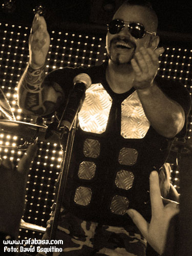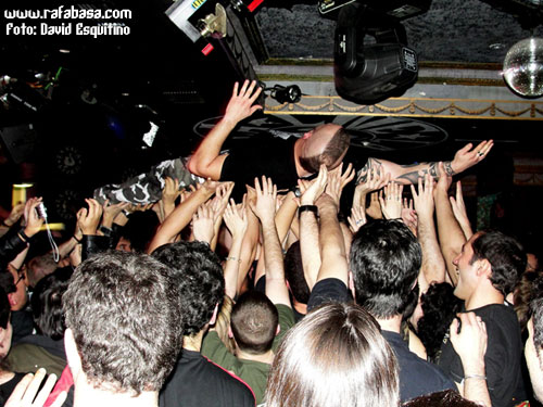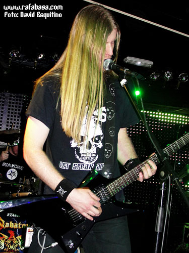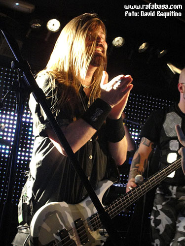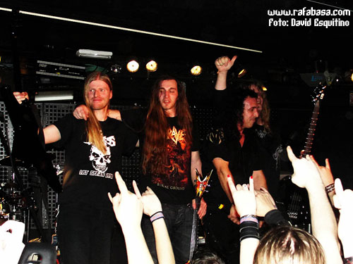 De todos modos, está claro que el protagonista es Joakim Broden, un vocalista y frontman excelente, que además en Madrid se vació como nunca, y todo ello sin parar de darnos las gracias, de sonreír y de alucinar literalmente con la reacción del público para/con ellos. "Escondido" la mayor parte del concierto tras su inseparable chaleco metálico y sus gafas de espejos, me encantó el detalle cercano de quitarse las gafas al final del show y bromear al respecto diciendo que ahora sí que nos veía y que era alucinante lo que tenía delante… Un tipo encantador y realmente agradable que nada tiene que ver con la imagen de tipo duro (con su particular cresta en ristre, algo nada habitual en el mundo del metal) que puede transmitir en fotos, y que podríamos imaginar al escuchar su voz totalmente grave y marcial (y que suena de lujo en directo, las cosas como son), pero nada más lejos de la realidad, y es que de verdad que era fantástico verle comentarnos cosas con una sonrisa de oreja a oreja, acercarse a la gente, dejarles cantar, e incluso finalmente hacer "crowd-surfing" sobre nuestros brazos y cabezas (desafiando el bajísimo techo de la sala, como podéis ver en las fotos), disfrutando como un niño con zapatos nuevos de cada momento del show.