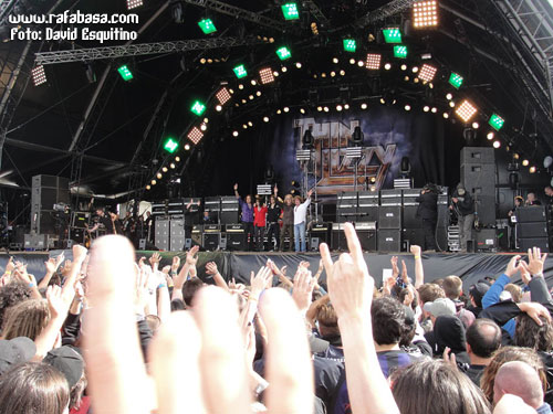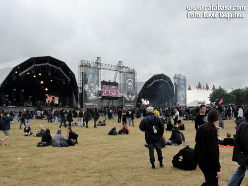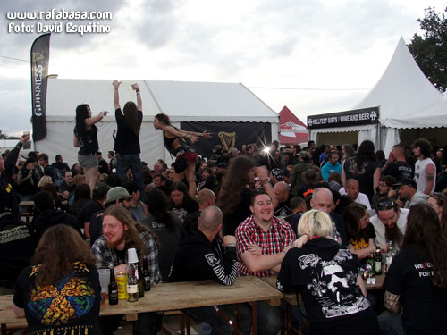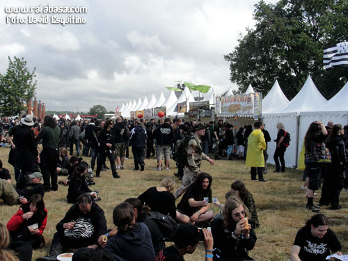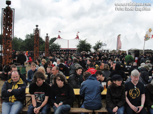 Y así a modo de repaso general, sólo me falta hablar de los grupos, a la postre lo más importante y la razón de viajar en nuestro caso tan lejos (o al menos fuera de nuestras fronteras). Las crónicas como tal de Carlos Oliver y Jordi Marsal (con alguna aportación mía incluso) las podréis leer en unos días, pero así a modo de vista de pájaro hay que decir que es una pasada poder ver tantos grupos y de tan variado pelaje en tres días, y es que han sido unas 120 bandas de todo tipo de rock duro y metal las que han descargado en esta edición de 2011… y muchas de ellas han hecho sesiones de firmas, por cierto, en una pequeña carpa habilitada para ello (aunque los más grandes se han escaqueado prácticamente todos, las cosas como son). Y hay que decir que en el festival hay dos escenarios principales (con sonido en general perfecto y los horarios clavados) y dos carpas, una dedicada al metal más extremo y underground y otra más centrada en sonidos más actuales y alternativos incluso. Y como son tantas bandas, siempre coincidían dos o tres conciertos al mismo tiempo, a veces de grupos muy distintos y otros no tanto (por ejemplo OZZY coincidía con DARK TRANQUILITY y HAWKIND), con lo que es imposible verlo todo, al menos si quieres ver conciertos completos, teniendo en cuenta, además, la cantidad de gente que había en cualquier escenario, grande o pequeño, y la distancia entre ellos (que no era muy grande, vale, pero siempre había un paseíto).