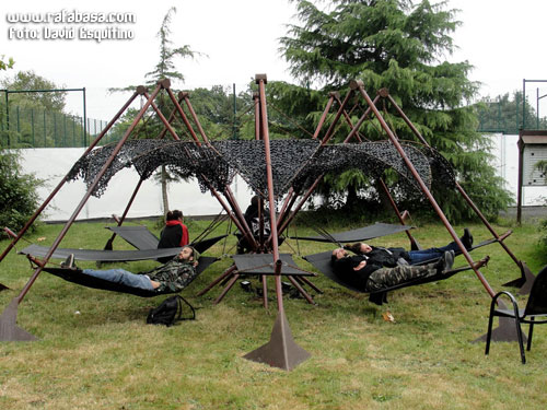 Y de la sala de prensa/invitados/VIP/artistas mejor ni os cuento, sólo os diré que es la mejor con diferencia en la que he estado, con amplia parte interior cubierta (una gran caseta de madera donde incluso se hacían pequeños conciertos y pinchaban DJ´s por la noche, además de poder seguir los conciertos en pantalla gigante), y otra exterior (al aire libre con hamacas, sillas, mesas, bancos, Internet, esculturas de metal, servicios especiales…) además de una sala expresamente para las entrevistas con varios departamentos separados, asientos, wifi… y un espacio habilitado para hacer fotos a los artistas (con focos, un telón negro de fondo…). Absolutamente profesional y con todas las facilidades para hacer nuestro trabajo de la mejor manera posible, descansar y recargar pilas… Y lo largo de un festival tan largo y extenso se agradece, os lo aseguro.