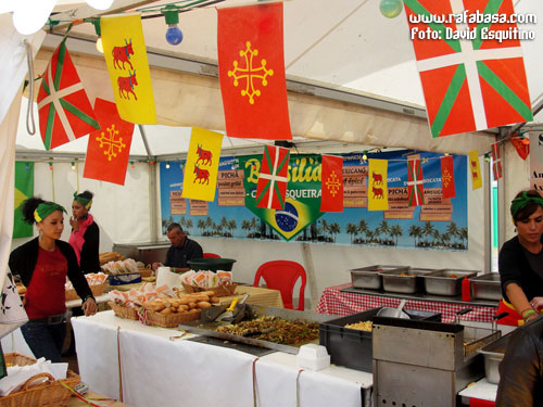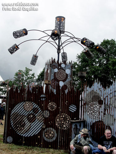 Del recinto en sí, aparte de los dos enormes escenarios principales, me quedo sin duda con la impresionante variedad de puestos de comida (desde todos los bocadillos imaginables hasta pizzas, tostas, platos de comida de todo tipo, hamburguesas, helados, postres, comida vegetariana, zumos, kebabs… ¡hasta había un puesto de chucherías!), y además a precios totalmente asequibles, algo que lamentablemente echamos en falta muchas veces en los festivales de nuestro país. Y para beber, refrescos de todo tipo y sobre todo cerveza y vino del festival, a buen precio (dos euros el vaso y once la jarra pero de litro y medio… de verdad, y luego te quedabas con los vasos y la jarra, de plástico y con logo chulo impreso), incluso con tercios embotellados expresamente para el festival, en una edición especial de cervezas realmente chula (¡y que estaba buena!). Además, el propio recinto en sí está decorado expresamente para el festival, con un montón de esculturas metálicas distribuidas por todo el recinto, "farolas", hogueras…, una pasada, especialmente por la noche, ya lo veréis en las fotos. Y con cantidad suficiente de servicios (portátiles pero que se limpiaban bastante a menudo), cajero, barras distribuidas por todo el recinto, personal de todo tipo…