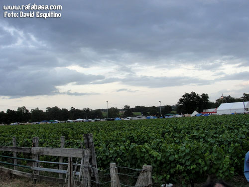 Pero bueno, dentro de las cosas que nos interesan, hay que comentar que el recinto es enorme, enclavado entre viñedos (y es que la zona del Loira y cerca de la Bretaña francesa es tierra 100% de vinos y la gran mayoría de estos campos son enormes extensiones de cepas), y con varias zonas delimitadas del festival: por un lado la acampada, enorme y un poco "al libre albedrío", aunque como ni hacen los treinta y muchos grados de España (y es que incluso ha hecho rasquilla los tres días del festival, especialmente el viernes y sábado, con lluvia intermitente incluida, sobre todo la primera jornada), ni aquello es 100% patatal, como lamentablemente tienen a bien meternos la mayoría de promotores en nuestro país (con excepciones positivas, por supuesto, pero otras veces…). Por otro lado, no nos libramos ni de las duchas con agua mayormente fría ni de la intensa animación sociocultural hasta altas horas de la madrugada, aunque esto es también parte de la salsa de los festivales, ¿no? Afortunadamente, aunque se pierda rollo de festival e incluso sea más difícil llegar a ver a los primeros grupos (que aquí todo empieza y acaba antes), uno ya está mayor para ciertas cosas y pude conseguir con tiempo hotel a algunos kilómetros del festival, pero al menos con el pack cama, ducha y váter cubierto, que no es poco.De todos modos, hay que decir que en la zona de acampada había las citadas duchas, baños de sobra y a su vez puestos de comida (¡incluso con un puesto de churros!) y bebida además de una carpa donde había conciertos y música durante buena parte del día y la noche.