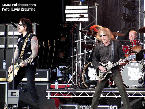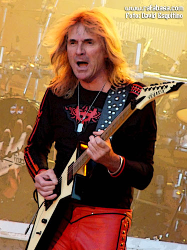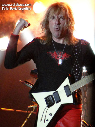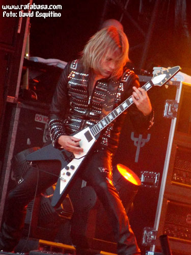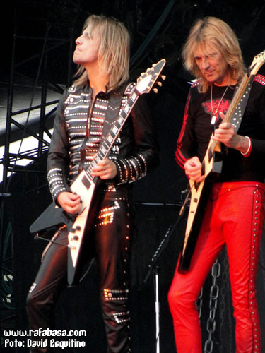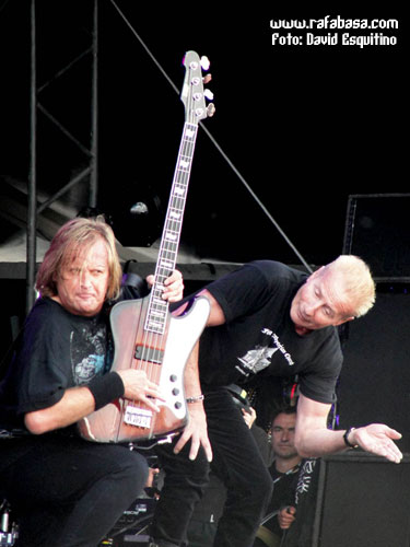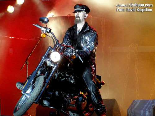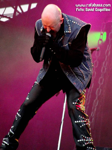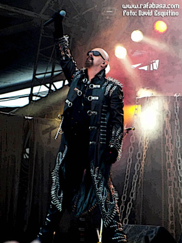 Y dejo para el final de esta categoría a JUDAS PRIEST, con muy buen show (algo corto pero lo esperado en este caso), excelente set list (con sorpresones como "Blood red skies", "Beyond the realms of death" o "Night crawler"), mucha mejor impresión de lo imaginado el nuevo guitarrista (por supuesto que no es KK Downing, esto ni se menta, pero han tenido mucha vista para coger a un tío con una imagen y estilo muy similar al original y que tiene rollo y desparpajo… además de tocar tela, lo que pasa es que es mirar al escenario y… no, es imposible sentirse satisfecho al respecto) y buen escenario y espectáculo (con pasarelas, telones muy chulos, pirotecnia y llamaradas…), además de la forma de ellos en sí. Incluso con un Halford en mejor forma de la que personalmente me esperaba, aunque es obvio que está a años luz del estado óptimo que muchos desearíamos y que hay temas que no puede se mire como se mire (y es que ni "Painkiller", que es un dolor por mucho que sea un cañón musical en directo, ni partes de "Victim of changes" o "Rapid fire" las puede hacer a día de hoy)… Es más, se nota que sufre muchísimo y canta ya casi más veces agachado, dándolo todo, sí, pero echando la bilis, que estando cómodo en el escenario dominando su voz y sus registros con toda la solvencia del mundo como antaño. Pero pese a todo, no estuvieron mal, no, y estoy seguro que en España, con el apoyo y el calor de nuestra gente estarán mucho mejor, ¡seguro!