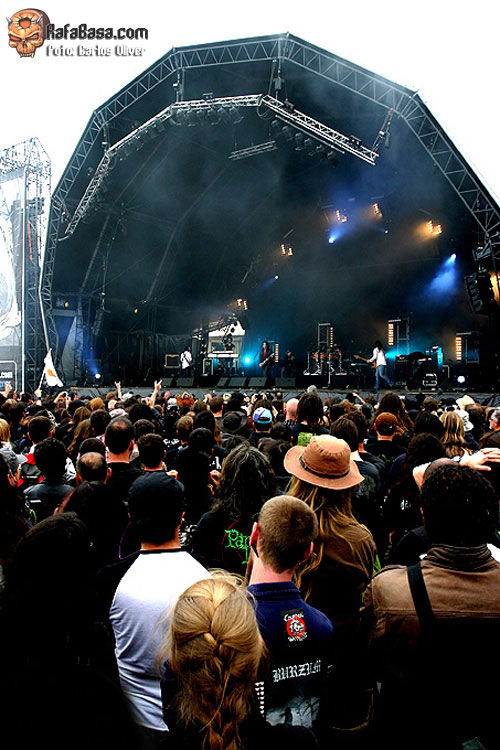 PRIMORDIAL nunca defraudan. Aunque el sonido del escenario/carpa Rock Hard no se comportara como ellos merecerían, la cañera banda irlandesa suplió estas carencias con su esfuerzo y pundonor. ‘No Grave Deep Enough’, como apertura, seguida por ‘Bloodied yet Unbowed’y ‘Lain With the Wolves’, posteriormente, fueron las elegidas para representar su último trabajo ‘Redemption at the Puritan’s Hand’ en un repertorio que, en esta ocasión, equilibró los nuevos temas con los himnos recientes pero ya consagrados como auténticos clásicos. Además de ‘Gods to the Godless’, de su tercer disco ‘Spirit the Earth Aflame’, la épica, emotiva y a la vez oscura ‘The Coffin Ships’, de ‘The Gathering Wilderness’, precedió a la acojonante ‘Empire Falls’, de ‘To the Nameless Dead’, que fue coreada y cantada por la gran mayoría del público como cierre del concierto.