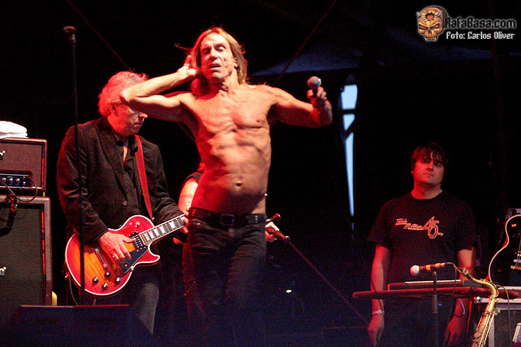 Con la duda de si ir a ver a una leyenda como Iggy Pop y sus viejos secuaces o si acercarme a las carpas a ver a CORROSION OF CONFORMITY y/o BELPHEGOR (dos bandas muy interesantes cada una en su estilo), al final me decidí por mi máxima de "a los clásicos hay que verlos al menos una vez en la vida", y enfilé para el escenario principal donde Iggy y sus STOOGES acababan de empezar su show. Y bueno, no digo que me equivocara con la elección, pero sí que me esperaba mucho más de tan legendario nombre. Y que nadie me malinterprete, porque es todo un espectáculo ver a un Iggy Pop en tan increíble forma física a sus sesenta y tantos: descamisado, fibroso, corriendo sin parar, cantando totalmente encima de la peña, y siendo protagonista absoluto del show con esa actitud que ha marcado escuela.