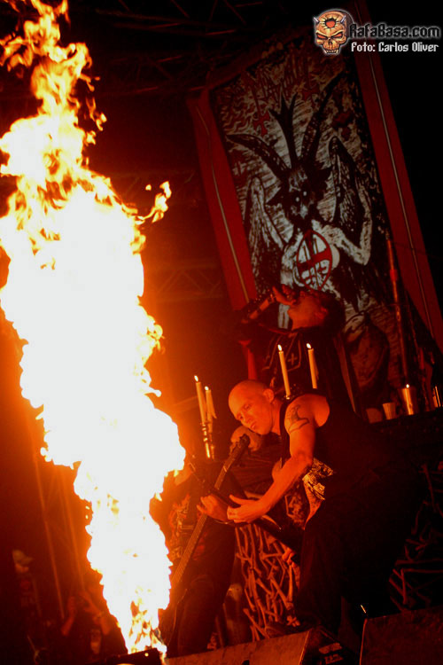 Transcurrió un lapso de tiempo más que considerable entre la marcha de POSSESED de las tablas y la esperada actuación de la banda noruega de culto que debía cerrar el primer día de festival: MAYHEM, que genera expectación allá adónde va. Parece que, en términos de notoriedad –por los motivos que sean-, el tiempo todavía no les pasa factura. Cruces invertidas por doquier, grandes lienzos estampados con el logo de la banda y el altar… Un altar forjado con huesos y calaveras en el mismo centro del escenario, hasta ocultando la inmensa batería de Hellhammer, tras del cual se situó, inmóvil, el impertérrito Attila para lanzar el sermón de una de las más legendarias bandas de Black Metal.