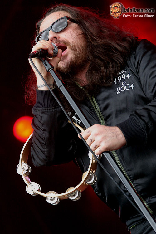 Para rematar el viernes (ya con un frío considerable y "chirimiri" constante de ese que no moja demasiado pero jode), la duda era entre IN FLAMES, darle una mínima oportunidad a MAYHEM o ir a por MONSTER MAGNET, de los que me habían hablado maravillas en directo. Y bueno, IN FLAMES hicieron uno de los imprescindibles del día según opiniones generales… pero no los vimos; MAYHEM… en fin, dejémoslo en que mi amigo Fernando Checa y yo fuimos de los muchos que les concedimos 5 minutos de cortesía, pero a los dos o tres como mucho de su actuación vimos que la tomadura de pelo ya la habíamos visto completa en Atarfe hace tiempo… Así que la decisión en este caso 100% acertada fue ir a ver el conciertazo de los de David Wyndorf (aún algo orondo, con el pelo más corto pero muy recuperado tras su rehabilitación de sus múltiples adicciones de antaño) en la carpa Terrorizer. De hecho, no fuimos los únicos, especialmente tras ver llegar riadas de la otra carpa poco a poco, y al final el concierto fue una olla a presión pero un superespectáculo y una lección maestra de cómo dar conciertos de rock sudoroso y guitarrero en directo.