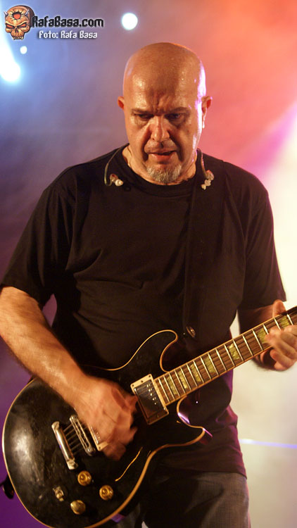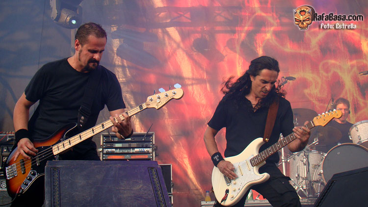 Pasadas las peores horas de calor (que pasaron factura a más de una banda, a TAKO entre otros o justo antes a TOPO), era el momento de disfrutar de la parte cúspide del día con las bandas más populares y una asistencia de público ya sustancialmente mayor. De hecho, era impresionante mirar la marea de gente ya concentrada a esas horas para ver a los grandes nombres del día, y es que al menos unas 4.000 personas andaban ya en el recinto para ver a TIERRA SANTA en este caso. Con un enorme telón con llamaradas sobre su logo de fondo, además de dos ídem laterales y ese teclado 100% escuela RAINBOW/PURPLE de Juanan Sanmartín (que creo que ha favorecido tanto el sonido actual del grupo), se presentaban TIERRA SANTA de nuevo en el Leyendas tras su parón de unos años.