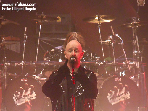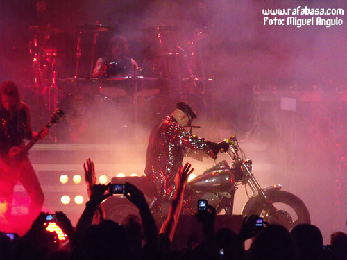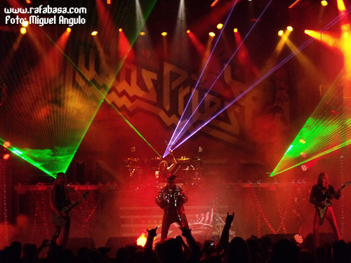 Halford cambia de chaqueta, se quita y se pone sus lentes… Al fondo aparecen telones con las portadas de los discos de los cuales están sonando temas entre grandes cadenas esparcidas sobre las bocinas y el escenario, gigantes tridentes flanqueando las alturas con grandes focos, humo, fuego, luces láser con visualizaciones en pantalla como salidas de un concierto ochentero y logrando meternos en un túnel del tiempo hacia unas décadas atrás logrando con todo esto dar un gran realce a la presentación. Hasta arriba del escenario una gran pantalla, para que los que se sientan en los niveles más altos de Coliseo vean bien lo que sucede en el escenario y puedan comulgar con sus sentimientos mas Heavys desde allá. El publico ovaciona cada tema y Halford nos aclara: "Existe el Death Metal, Speed Metal, Black Metal…, todo es Heavy Metal y es muy bueno… ¡pero JUDAS PRIEST es Metal Clásico!" al tiempo que levanta su mano recibiendo una ovación de las más calurosas de la noche. Como ya habíamos visto en videos tomados con foto cámara, móvil. etc. el tema "Breaking The Law" ha sido en una versión instrumental, tipo "karaoke" en vivo para que el público lo cante y lo celebre como un tema suyo, y además es buena manera de que el publico protagonice el evento durante un momento mientras Rob descansa su voz para retomar su poder con "Painkiller" en la cual sonó como un verdadero y único dios del Metal.
