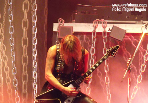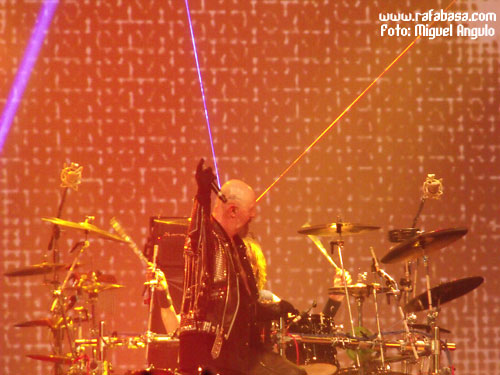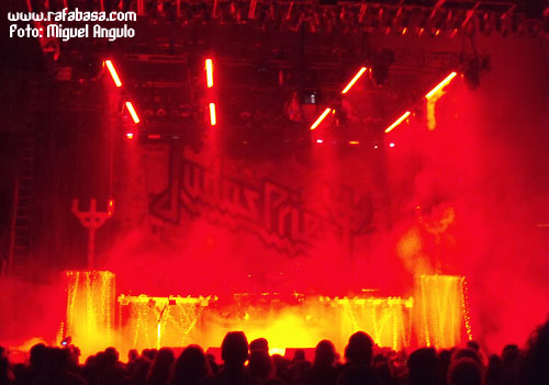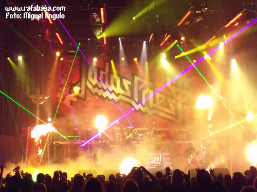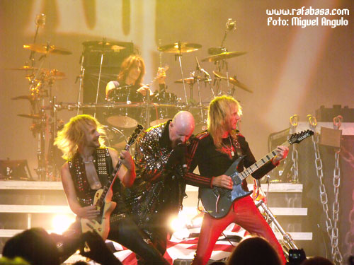 Iniciaron con "Rapid Fire", que ya habían usado como tema de apertura durante la gira anterior en la cual celebraban el treinta aniversario de "British Steel". Siguieron con "Metal Gods" como ya es costumbre, lo cual me parece un buen paradigma para ir reconectando poco a poco el sentimiento personal con lo audiovisual del show. Halford se ha venido reprimiendo cada vez más su dinamismo físico en el escenario, como ya lo habremos notado en giras pasadas. Glenn se ve más expresivo y en comunicación con los presentes, no habría de esperar menos, y es que ya no está ahí su compañero KK, quien se encargaba de ser el puente banda-audiencia durante los épicos solos de guitarra. Ahora está ahí Richie Faulkner con una guitarra bastante sobria, clara y concisa, haciendo gala de mucha energía, juventud y libertad de actuar libremente en su perímetro escénico. De uno de sus primeros discos rescatan "Starbreaker", ¡buena elección!. Para los amantes de los trabajos más antiguos suena también "Never Satisfied", y aquí viene la decepción para quienes habían estado esperando temas que la banda ha estado tocando en otras ciudades: prefieren dejar de lado "Rocka Rolla" y peor aun "The Sentinel". ¡¡¡No!!!… ¿y "Turbo Lover"? Dichosos aquellos que vieron y escucharon eso… tal vez por última ocasión.