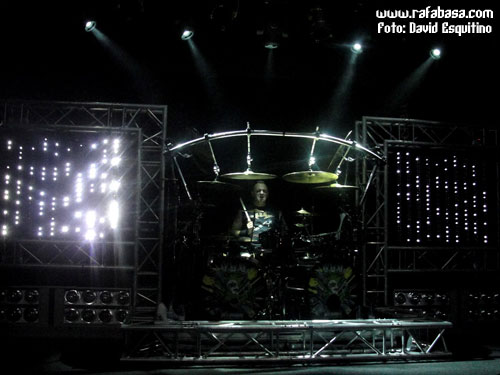 Total que el concierto pintaba feo y eso que el escenario tenía buena pinta desde el principio, lo que comprobaríamos poco después cuando se retiraron las lonas que tapaban la enorme batería de Francesc Jovino (¡qué buen batería siempre que le he visto, por cierto!) con la atractiva portada del nuevo disco en el doble bombo, y unas pantallas de luces leds laterales sobre unos trust (vigas metalicas) que le daban al escenario una imagen muy vistosa y pintona, algo así a medio camino entre futurista y heavy al 100% y, en definitiva, bastante más atractivo de lo que tenemos la oportunidad de ver en una sala como la Heineken habitualmente. Y es que a veces no cuesta tanto darle ese punto visual necesario al escenario, ¿no?…