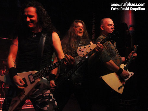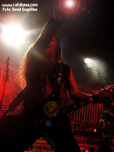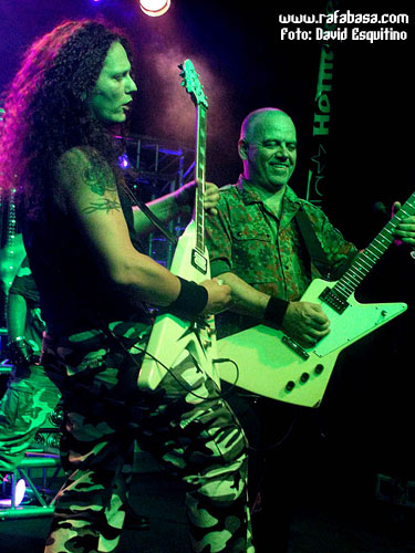 Pequeño descanso, y es que habían comenzado "a saco", para que Igor y Stefan jueguen un poco con nosotros antes de meterse de lleno en uno de los superclásicos de ACCEPT como es "Princess of the dawn", que todos coreamos con ganas, claro. Por supuesto, no faltaron sus poses juntándose en primera línea del escenario ni el contrapunto melódico/rítmico entre las guitarras de Igor Gianola y de Stefan Kauffman, que son una de las señas de identidad más claras de la banda. Era el momento de relajar el ambiente después de toda la tralla inicial, y me sorprendió la buena recepción con la balada del nuevo disco, "I give as good as I get", que de hecho les quedó muy bien bajo unas calmadas luces azules. Era el momento del sólo juguetón de Igor Gianiola, que se divirtió de lo lindo paseándose por toda la sala e incluso jugando con su técnico de sonido mientras todos mirábamos atónitos cómo se movía la abultada melena morena y rizada tan característica del guitarrista suizo correteando por la Heineken para volver al escenario por el lateral ante los aplausos muy merecidos del respetable.