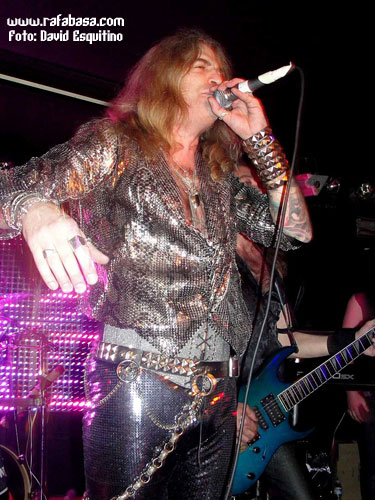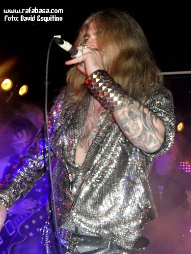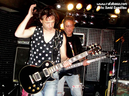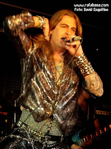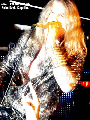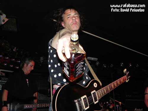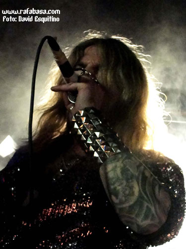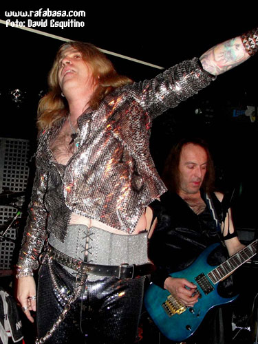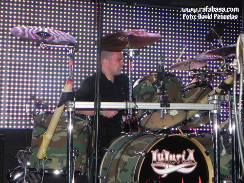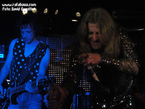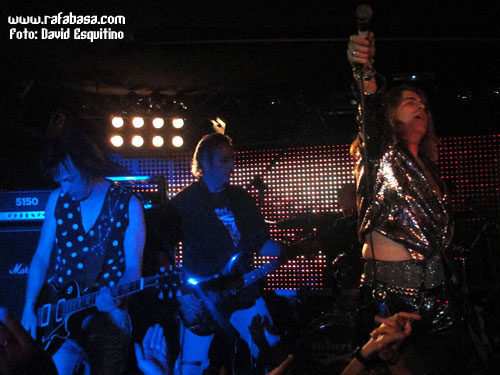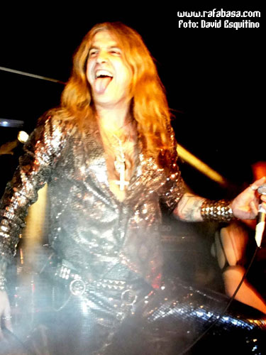 Como detalles concretos, me apetece comentar que Chepas cada vez me gusta más como guitarrista (vacilón, macarruzo y con un sonido totalmente propio y 100% marca de la casa), que Julito estuvo menos activo que otras veces (y es que está lidiando en las últimas semanas con difíciles momentos personales y desde aquí le mandamos un abrazo y le deseamos lo mejor), que Maikel, "El Tanque", es un batería espectacular… y que Óscar hoy nos sorprendió vestido de "lentejuelas", incluso con una chupa mezcla de leopardo y brillos que me hizo acordarme de la imagen de Ozzy en la gira del "Ultimate Sin"… (Óscar, sabes que iba a decirlo, jeje). Recuerdos de listillo aparte, se agradece que el vocalista mime su imagen en directo y nos ofrezca siempre algo diferente y trabajado al respecto. Aparte de esto, en este día especial, y recordándome (y contradiciéndome con todo el derecho y acierto del mundo) que Madrid sí era una ciudad fetiche para LUJURIA, quizás varió un poco su discurso habitual desde el escenario haciendo referencia sobre todo al hecho de haber cumplido 20 años, de tener la sala llena de heavies y roqueros de todas las edades, y de que teníamos que despertar y volver a recuperar la calle como antaño… aunque en algún momento no se pudo morder la lengua y hubo que acordarse de Urdangarín, Camps, Ana Botella y demás personajes "de actualidad" que se ríen de nosotros y nos amargan la existencia en los últimos tiempos.