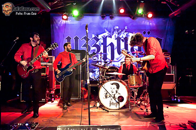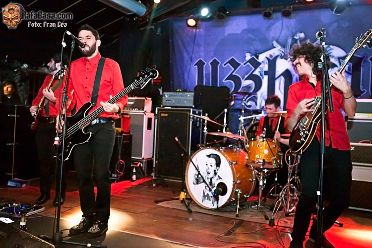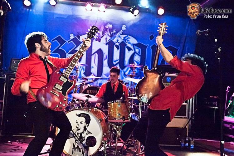 Desde Asturias (Mieres) llegaban HELLTRIP, a los que no había "catado" en directo hasta ahora y que despertaban mi curiosidad ya que lo que he escuchado de ellos, sobre todo su último disco cantado en español Animal, me gustaba por su sonido salvaje y con gran herencia de los 70s desde los MC5 a los homenajeados con un Search And Destroy, The Stooges… y de las bandas de rock escandinavo. Inmaculados con sus camisas rojas y las corbatas negras (un poco en onda Hives) no hicieron prisioneros y desde el primer acorde lleno de fuzz y distorsión salieron a morder buscando la implicación de un público que creo no sabía bien lo que se les venía encima. Alternando las voces, corriendo por la sala o tocando encima del puesto de merchandising fueron chulos y desafiantes (de eso se trata) y sobre todo sólidos ya que consiguieron crear un muro de sonido sobre el que intercambiar solos llenos furia y ritmos para poner a bailar al más chulo (All Destroyed By Love) e incluso una versión del Massacre de Thin Lizzy pasada por su sello. A pesar de encontrarse estilísticamente en otro lugar hicieron un buen trabajo.