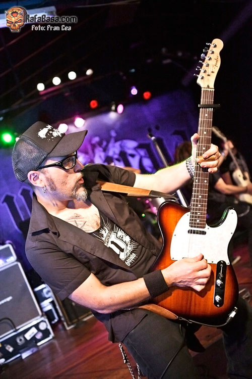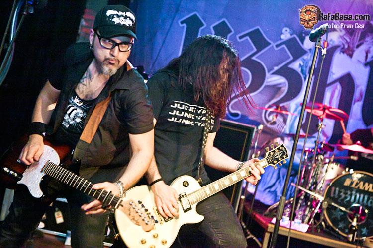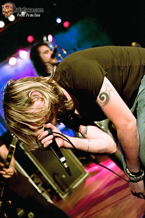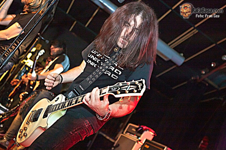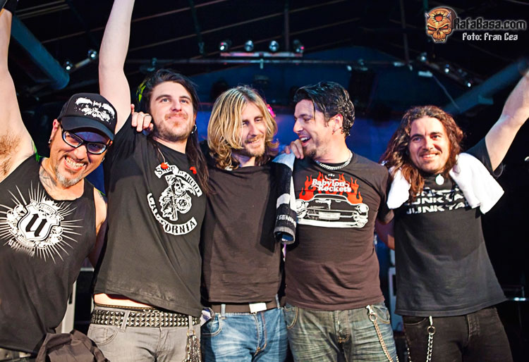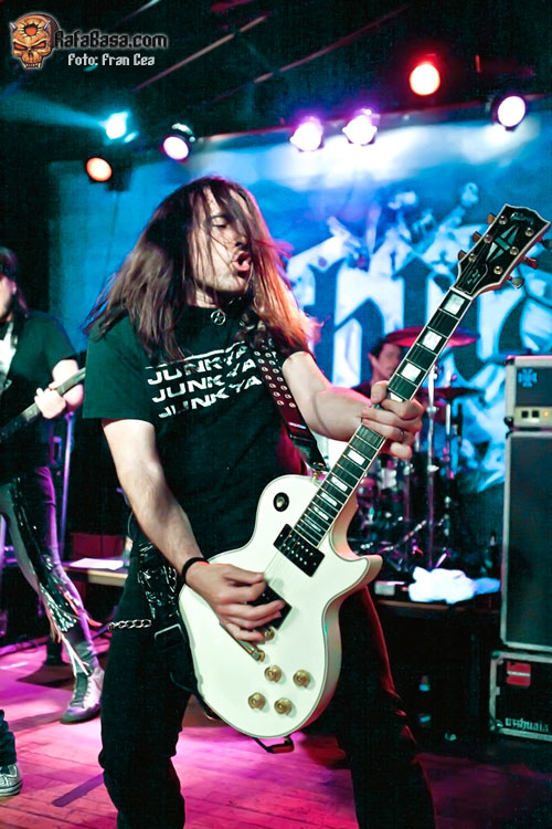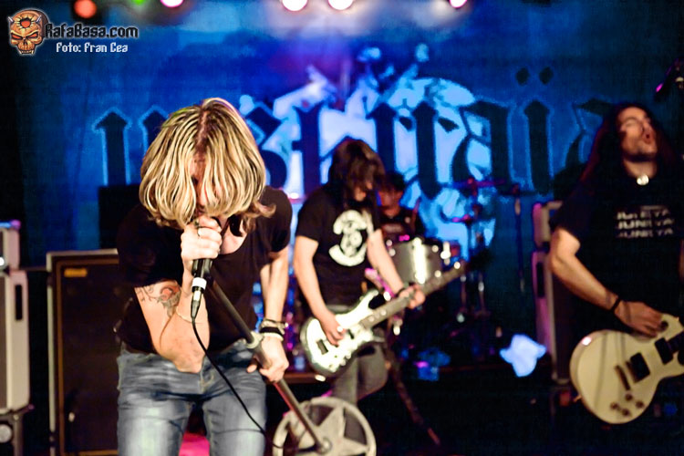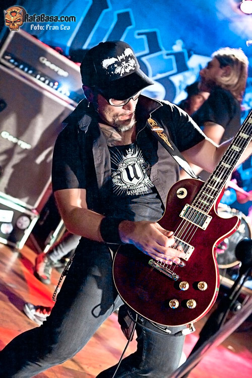 A lo largo de los años he visto a UZZHUAÏA muchas veces en concierto, desde bares de reducido aforo a festivales y en esta gira en su paso por la Sala Porta Caeli de Valladolid que ya os conté en esta misma página www.rafabasa.com/2011/02/uzzhuaia-en-valladolid-cronica-y-fotos y nunca me han defraudado. En mi opinión, y salvando las lógicas distancias (que nadie se me lance al cuello), son la translación más evidente de lo que es una banda de hard rock americano de carácter que hemos tenido en esta santa tierra. Y esta afirmación está basada en que además de su innegable pericia a los instrumentos, las canciones (que es lo más importante) y su entrega sobre las tablas, cada miembro que conforma la banda tiene una personalidad única y diferenciadora que lo identifica con claridad (algo así como tenían grupos como MOTLEY CRUE, THE CULT o los primeros GNR, reitero lo de salvando las distancias). De esta manera Alex es la garra y la fuerza sin control, Izzra la pericia y maestría más comedida, Jose la simpatía, la pegada y el estilo en la batería, Alvaro el más salvaje e introvertido y su frotman Pablo Monteagüdo el "artista" más completo y el más creador. Todo esto, que se percibe de manera discreta, hace que se cree una conjunción de personalidades distintivas y que no haya una banda comparable a los Uzz en el estado.