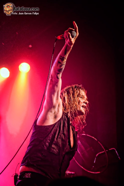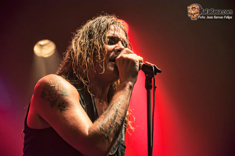 Sebastian y su banda salieron a escena a las 10 en punto de la noche, arropados por los gritos de un público en el que destacaba la presencia femenina y que superaba la media entrada en la sala Caracol de Madrid. Desde el primer minuto, el cantante desató toda su energía sobre el escenario, enchufando a todo el mundo al comenzar con uno de los mejores temas de la discografía de SKID ROW: Slave To The Grind. Ya en estos compases iniciales pudimos observar que Sebastian mantiene un estado de forma envidiable, lo que le permite seguir moviéndose como toda la vida. No faltaron los típicos puñetazos al aire ni, cómo no, ese micro dando vueltas cual lazo de rodeo (aunque en este punto Seb se cortó un poco por la cercanía del público a la tarima y más aún después de atizarle a su guitarrista Johnny Chromatic en la cabeza. Incluso llegó a comentar que no quería ganarse una demanda esa noche, ¡juas!)