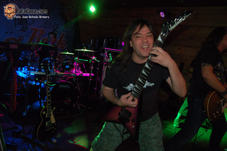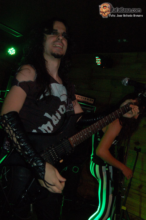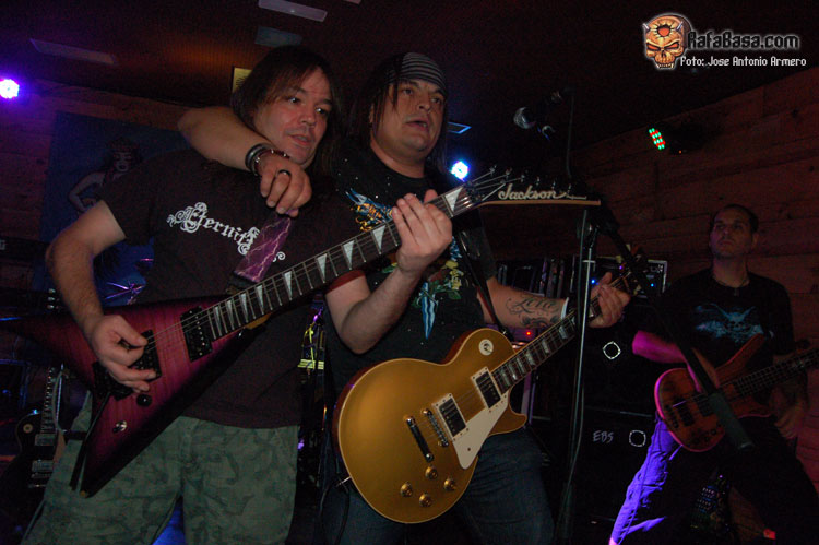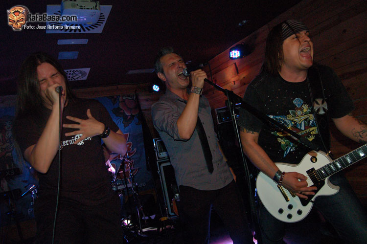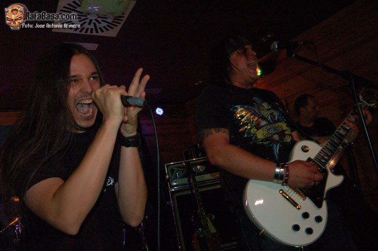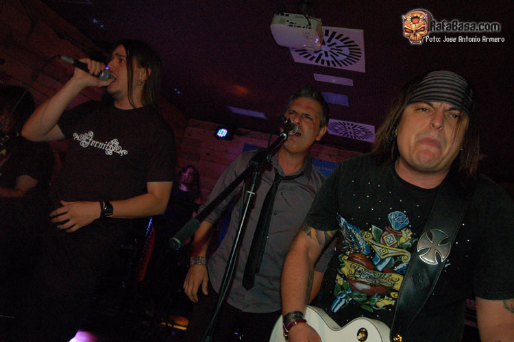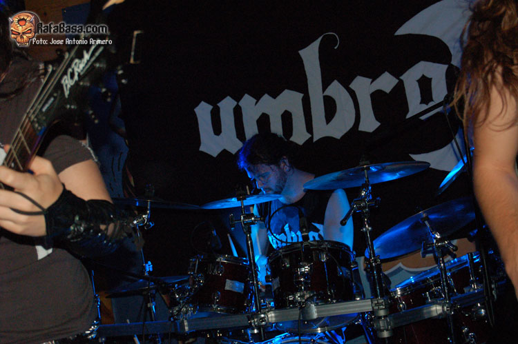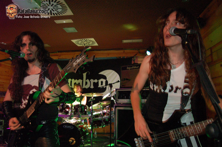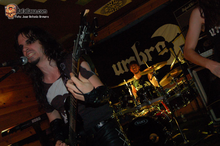El trajinar de gentes conocidas en las inmediaciones de la sala, hacía que no pudiera presenciar el inicio de UMBRA, que ya estaban dándole a los acordes de Falsas Apariencias, tema de la demo que ya todos conocíamos y que generó un ambiente idóneo, a ésta le seguirían un par de temas nuevos llamados El Ojo De Mi Huracán y Esclavos, dando una de cal y otra de arena, pues mientras una encajó de coña la otra necesitaba algún retoque en la voz que entraba muy forzada, nada que no se pueda corregir, tal y como se hizo al momento escupiendo otros dos de los temas que vienen incluidos en Prólogo, la demo que defiende hasta el momento la banda, el primero sería Sangre de Metal, todo un himno ya que provoca el delirio de sus seguidores más acérrimos y la otra sería En Algún Lugar, tema que David el vocalista dedica a un pariente suyo. Mención especial merece este voceras al que se le adivinan perfectamente sus influencias con Blackie Lawless, al que emula de forma más que correcta tanto en sus registros vocales como a la hora de saltar a escena, tanto en imagen como a la hora de desprender desparpajo frente a los presentes, sabiéndoles guiar y animar en todo momento.
