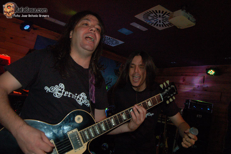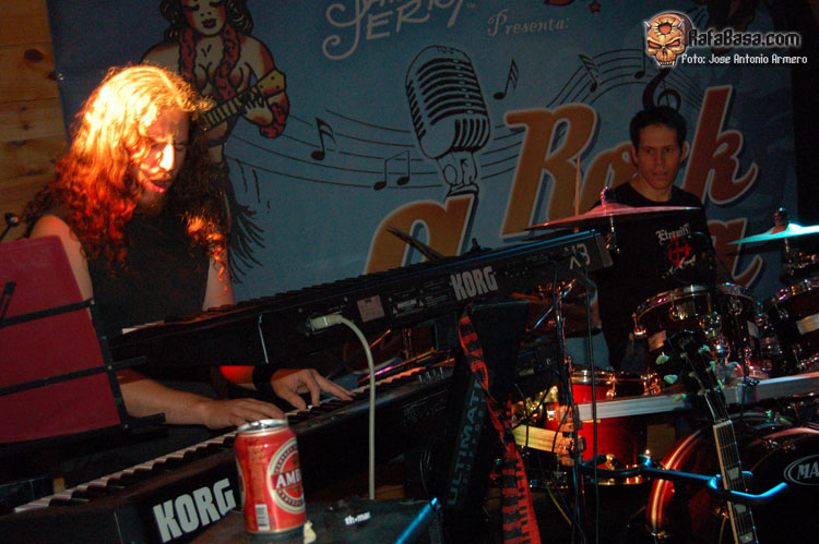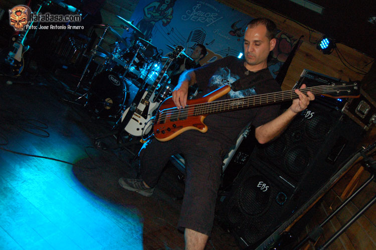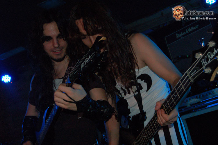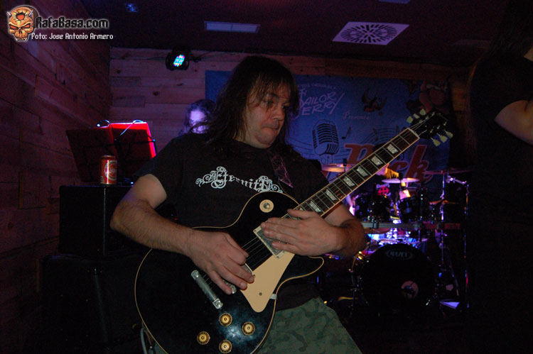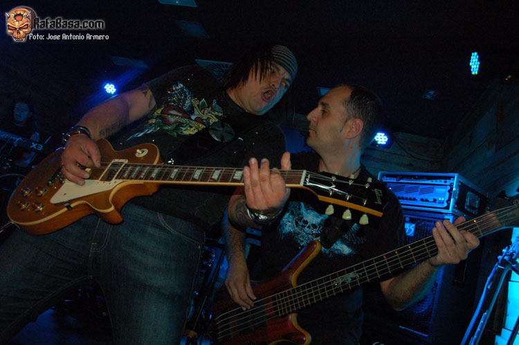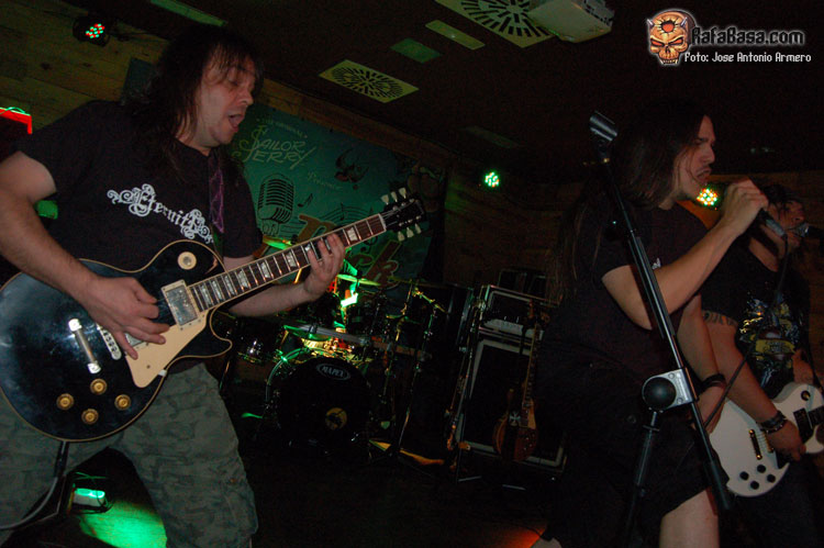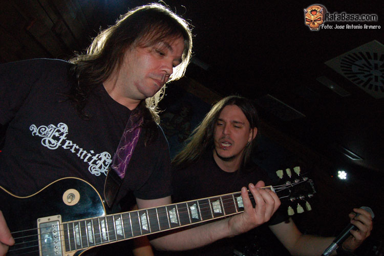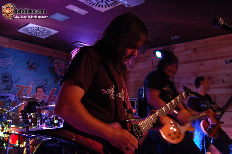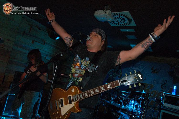 El trajinar de gentes conocidas en las inmediaciones de la sala, hacía que no pudiera presenciar el inicio de UMBRA, que ya estaban dándole a los acordes de Falsas Apariencias, tema de la demo que ya todos conocíamos y que generó un ambiente idóneo, a ésta le seguirían un par de temas nuevos llamados El Ojo De Mi Huracán y Esclavos, dando una de cal y otra de arena, pues mientras una encajó de coña la otra necesitaba algún retoque en la voz que entraba muy forzada, nada que no se pueda corregir, tal y como se hizo al momento escupiendo otros dos de los temas que vienen incluidos en Prólogo, la demo que defiende hasta el momento la banda, el primero sería Sangre de Metal, todo un himno ya que provoca el delirio de sus seguidores más acérrimos y la otra sería En Algún Lugar, tema que David el vocalista dedica a un pariente suyo. Mención especial merece este voceras al que se le adivinan perfectamente sus influencias con Blackie Lawless, al que emula de forma más que correcta tanto en sus registros vocales como a la hora de saltar a escena, tanto en imagen como a la hora de desprender desparpajo frente a los presentes, sabiéndoles guiar y animar en todo momento.