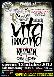 Una de las fechas más importantes del año para el público de la zona centro se acerca peligrosamente, y desde SFTD no queremos dejar pasar la oportunidad de recordaros que el Viernes 12 de Octubre tenéis una cita con el brutalismo tribal de los madrileños VITA IMANA en la Sala Bumerang de Guadalajara, donde les tendremos acompañados por dos de las mejores bandas que jamás ha visto Guadalajara como son los KHAYMAN y los CABRAMACABRA, que pondrán el color local a una velada que promete recordarse por mucho, mucho tiempo. Estos son todos los detalles de la fecha: