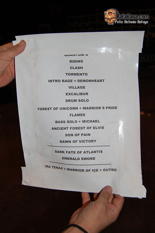 De nuevo la bailarina aparece en escena y el grupo sale con uno de los singles de su nueva obra. Las imágenes del video sirvieron para dar mayor vistosidad a ese revestido de coros "Dark Fate Of Atlantis". Puede llevar camino de convertirse con el tiempo en un clásico, al menos es de los que más impacto ofrecen en directo. Aunque no se si algún día alcanzará lo que supone "Emeral Sword", que puso a los presentes puño en alto entonando esa memorable melodía, ese gran estribillo eterno. Podíamos intuir que este sería un álgido final, pero la banda prefirió redondear la actuación con un recuerdo al debut de RHAPSODY, aquel que supuso una nueva visión en torno al heavy metal y la música clásica fundidos desde el mismo momento en que se creaban las canciones, no como una aportación extra. Ese remate al concierto llegó tras la intro de "Ira Tenax" con "Warriuor Of Ice". Así se abrió aquel trabajo llamado "Legandary Tales" de 1997 que te guste más o menos el estilo, hoy sería uno de los álbumes claves en la evolución de nuestra música. Uno de esos discos que suponen algo importante en la historia de un género musical.