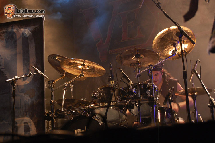 Antes del solo de batería defenderían nuevamente su apuesta actual con "Excalibur", fiel en todos los sentidos a la trayectoria de Luca Turilli. Alessandro nos explicó la falta de Dominique Leurquin por un percance en su mano que impidió que el grupo hoy contara con dos guitarristas y prometiendo volver en un futuro con el grupo al completo. Algunas guitarras estuvieron grabadas, pero de forma general no se apreció tanto, cayendo todo el peso sobre Luca. Pensé que se iba a dejar notar más esta falta y que se iba a desnaturalizar más el sonido, pero tampoco fue así, apreciándose de forma general tan solo una única guitarra que se desdoblaba en su trabajo. Al menos cuando no metían todos esos coros y orquestaciones que, en el caso de RHAPSODY, están totalmente justificadas puesto que sería imposible de llevar al directo una propuesta así de otra manera. Eso sí, en comparación a cuando les vi en Barakaldo con RHAPSODY OF FIRE me pareció que aquí buscaron un efecto más ampuloso, lo que camuflaba las voces hechas en directo en algún momento. Cuando pude ver a Fabio Lione su voz se dejaba notar más cruda en medio de toda esa parafernalia menos voluminosa, algo que hubiera agradecido en este caso también para apreciar más nítida la labor de Alessandro Conti.
