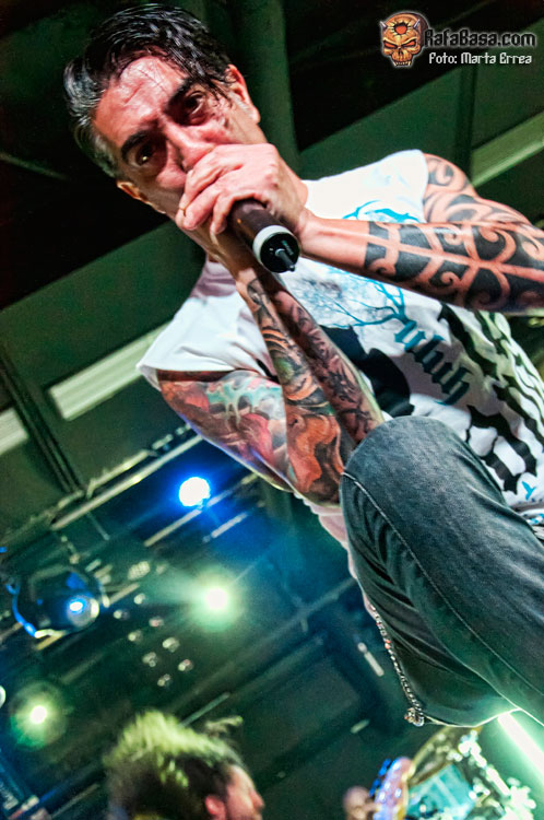 Dejando de lado estas reflexiones, que no obstante me apetecía reseñar, la sala con su preciosa decoración pulp se iba llenando más y más hasta las 21:30 en que se hizo el apagón de luces general dando el pistoletazo de salida a la brutal descarga de unos VITA IMANA pletóricos que, como siempre, salieron como una apisonadora derrochando energía por doquier; y es que ya mientras sonaba el sample de inicio Román ensayaba la potencia de sus saltos guitarra en ristre, mientras el batería Daniel daba la señal de comienzo y ese torbellino denominado Javier Cardoso se daría la primera de las muchas carreras de la noche por la plataforma que se había colocado en el centro de la Cats, para que público y banda estuvieran aún más juntos.