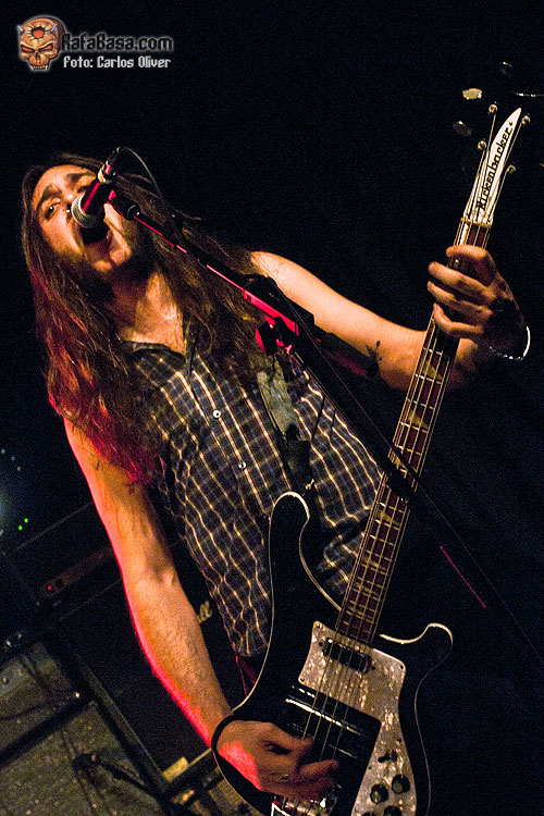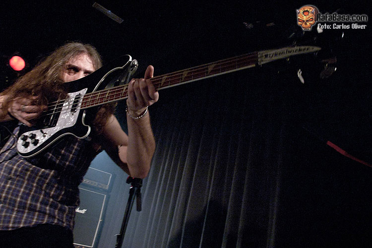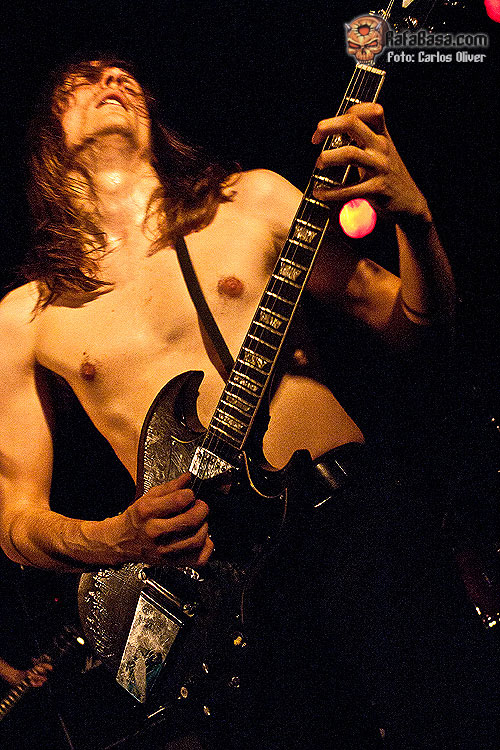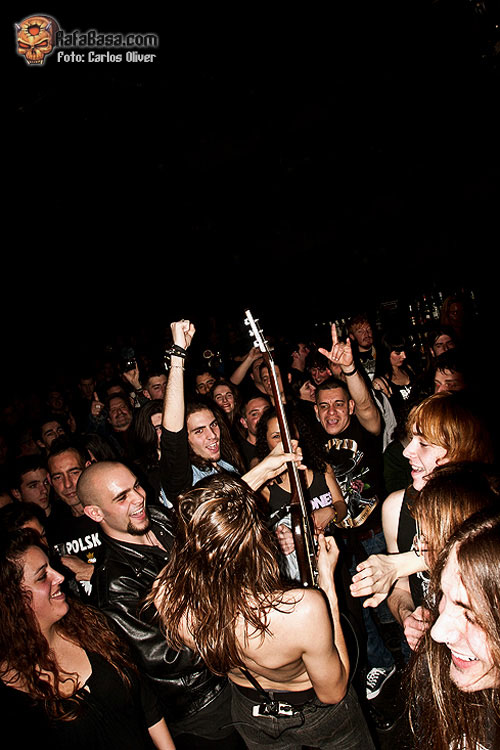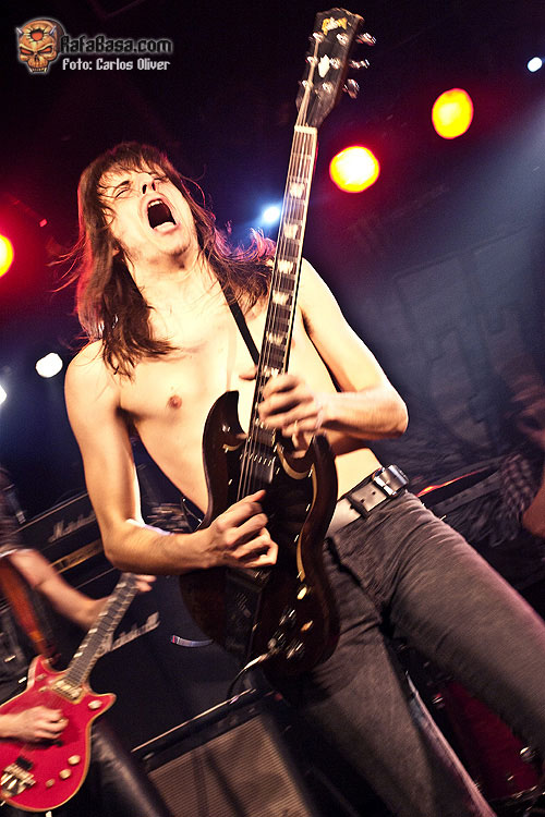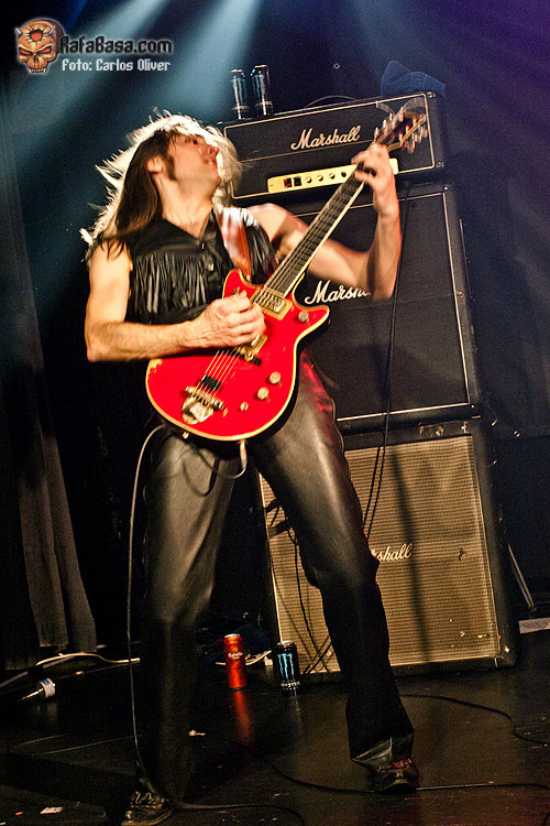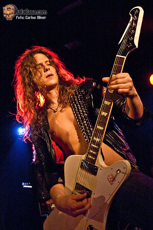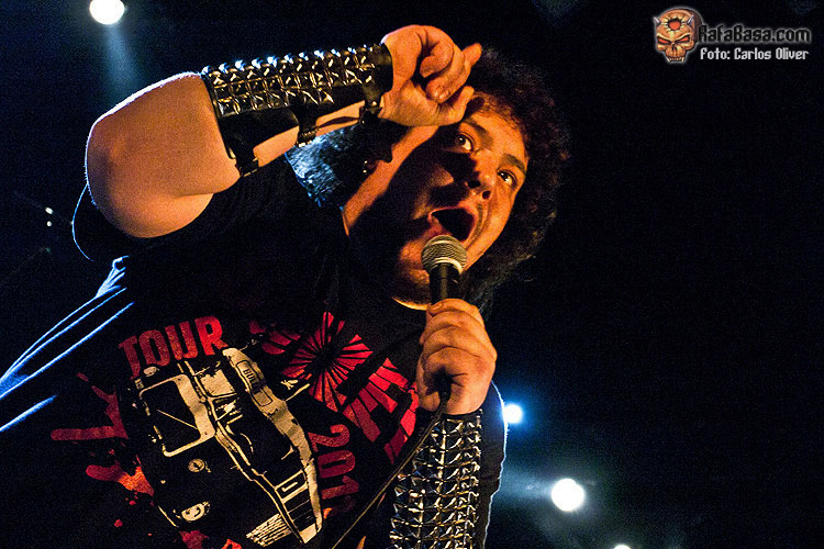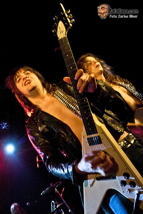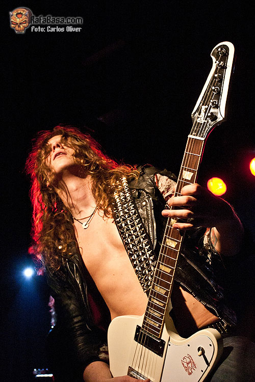 el ritmo contundente y atronador "Highway Pirates", en el que volvió a brillar con luz propia, la reciente incorporación de la banda Alexander Lyrbo, obsequiándonos con un vistoso y vibrante trabajo solista, haciendo volar sus dedos sobre el mástil de su guitarra, evocando las posturas de los grandes guitarristas de la década de los ochenta, provocando una contestación muy sonora por parte de la audiencia, que se fundió con el inicio del corrosivo y cortante "Rambling Man", perteneciente a su debut de 2006 "Heading For The Top", que fue el encargado de preceder a "The Rebels Return", en la que Hoffer salió a escena ataviado con una vistosa capa roja, un tema con una estructura algo más densa y menos directa , pero que dio mucho juego en directo, a la hora de interactuar con la audiencia, haciéndonos cantar, antes de que la guitarra de Hampus Klang, nos arrastrase hacía un final por todo lo alto que acabaría con el guitarrista haciendo sonar su instrumento con los dientes al más puro estilo Jimi Hendrix. Cuando todavía no se había cumplido una hora de actuación de BULLET, empezaban a sonar los acordes del tema con el que los suecos pondrían el punto y final a su show de esta noche , el hímnico y pegadizo "Bite The Bullet", que volvió a poner la sala patas arriba, con todos los asistentes levantando los puños al aire, cantando el contagioso estribillo para poner un brillante punto y final a una actuación que se hizo corta, y que dejo al personal con un muy buen sabor de boca. Gran descarga de los suecos, que demostraron que son una banda a tener muy en cuenta de cara al futuro más inmediato, el único pero que se puede poner a su actuación, es la labor escénica de su vocalista Hell Hofer, al que se vio demasiado estático en su papel de frontman, y cediendo excesivo protagonismo a sus compañeros.