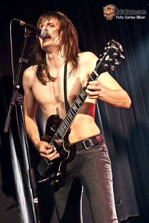 Evidentemente a estas alturas de concierto, viendo la respuesta del respetable, la descarga de ´77 ya era todo un éxito, pero faltaba poner el broche de oro a una especular actuación, y que mejor manera que adentrarse en una compleja y experimental "Promise Land" en la que Raw, LG y Armand se intercalaron las funciones de vocalista, consiguiendo entre los tres , poner a toda la sala dando palmas, mientras se coreaba el estribillo de la canción, en pocas ocasiones, he tenido ocasión de ver una banda tan joven y con tantas tablas, y es que estos cuatro chicos han hecho de la carretera su hogar, y eso se nota a la hora de saber marcar los tiempos de la actuación, consiguiendo que el ánimo del público no decaiga en ningún momento. El tiempo se estaba acabando, pero todavía tendríamos ocasión de saborear dos excelentes manjares, la coreadísima, e insistentemente demandada por la audiencia "Gimme A Dollar", que con su arrolladora furia roquera y su vacilón estribillo, se ha convertido en un auténtico himno para todos los seguidores de la banda, conviertiendo la sala en un desmadre absoluto, con la gente bailando en círculos ante el asombro de unos músicos, que no pararon de acelerar el tema, provocando una gran ovación. Para rematarnos definitivamente, después de una intensa sesión del mejor hard rock ´77 se decantaron por el delirio alucinógeno que propone "Big Smoker Pig", con toda la sala coreando nuevamente el estribillo, mientras LG Valeta se embarcaba en una nueva excursión entre el público, antes de dar por finiquitada la actuación del cuarteto ante el delirio y satisfacción de un público que acabo rendido y coreando el nombre de la banda, mostrando su plena satisfacción ante el auténtico recital ofrecido por ´77.