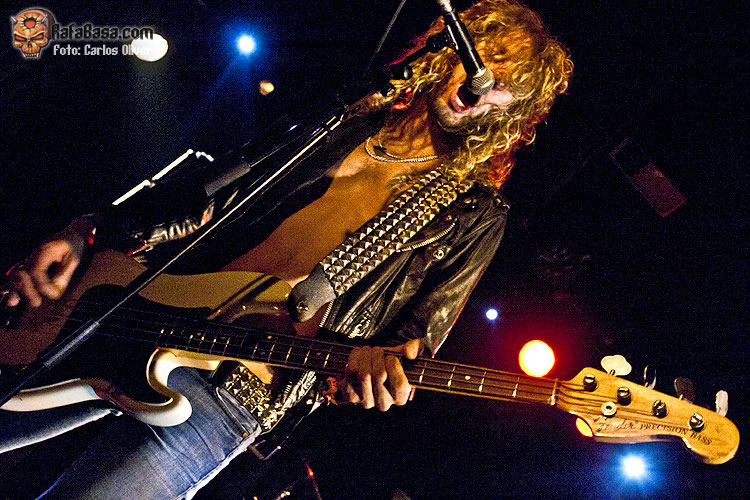 A la hora marcada para el inicio del show, había un excelente ambiente dentro de la sala pequeña del Apolo, así que, haciendo gala de una puntualidad inglesa, saltaban sobre las tablas los suecos BULLET, liderados por su tripleta de cuerda que se presentan ante el público del Apolo a pecho descubierto, ataviados con cazadoras de cuero y botas camperas blancas, mientras su vocalista Hell Hofer, aparecía en escena con unas vistosas muñequeras repletas de tachas, ocupando el centro del escenario para arrancar su descarga con la magia contagiosa de la aplastante "Into The Night", tema que cerraba su anterior trabajo "HIghway Pirates", y con el que los suecos evidenciaron que no iban a tener ninguna clase de problema para conectar con un público que se mostró plenamente conocedor del material del quinteto, y es que el explosivo coctel que BULLET propone con su poderoso hard rock-metalizado, liderado por la cortante voz de Hoffer, y esos estribillos potentes y pegadizos, resulta altamente efectivo a la hora de dejarse arrastrar por su ímpetu y potencia arrolladora , convirtiendo la sala en una auténtica fiesta. Aunque el motivo de esta gira, era presentar su última entrega "Full Pull", el quinteto sueco, desgranó un repertorio muy equilibrado, rescatando temas de cada una de sus cuatro referencias anteriores, así que la segunda pieza de la noche fue la vitalista "Turn It Up Load", extraída de su debut "Heading For The Top", que fue introducida por el demoledor bombo de Gustav Hjortsjö, contagiando instantáneamente a la audiencia, que siguió el tema levantando los brazos, mientras no dejaba de cabecear, siguiendo el ritmo de los poderosos riffs de guitarra.