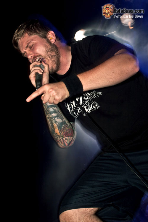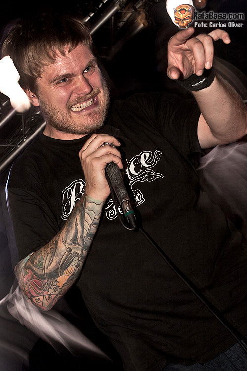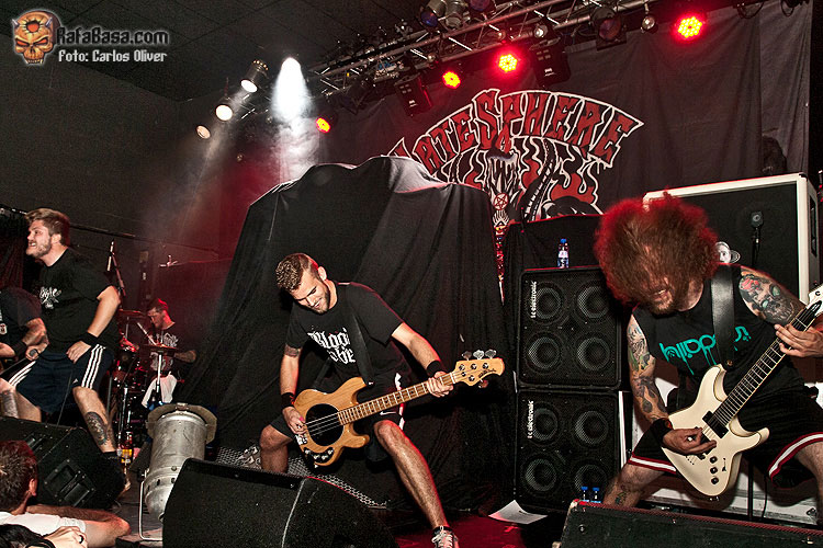 Para abrir boca, y calentar motores de cara a la descarga del poderoso cuarteto sueco, contábamos con la presencia de unos ilustres veteranos de la escena thrash/ death, los daneses HATESPHERE que, precisamente ese mismo día 27 de Septiembre, ponían en circulación su última obra de estudio "Murderlust" de la que nos ofrecieron algunas pinceladas, demostrando que la banda sigue manteniéndose fiel al estilo y la personalidad de sus inicios. Ante una sala en la que todavía estaba entrando el personal, el quinteto danés arrancaba su actuación al son del devastador "Lies And Decait" en el que pese a un sonido algo embarullado dejaron claro que son unos auténticos maestros a la hora de combinar partes rápidas y poderosas con unos tempos más crujientes y desbordantes de "groove". A pesar del continuo carrusel de cambios que ha sufrido la banda durante los últimos años, parece que la actual formación se ha consolidado como un bloque sólido y compacto, mostrándose muy solventes y resolutivos a la hora de encarar clásicos como el poderoso up-tempo "500 Dead People", que cerraba su tercer trabajo "Ballet Of The Brute" de 2004, o el aplastante "Floating" con el que consiguieron contagiar su vitalidad a las primeras filas.