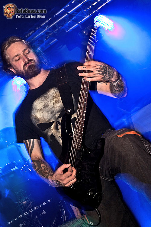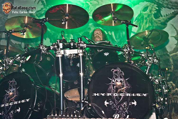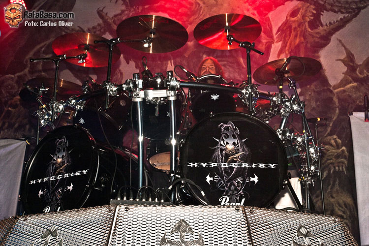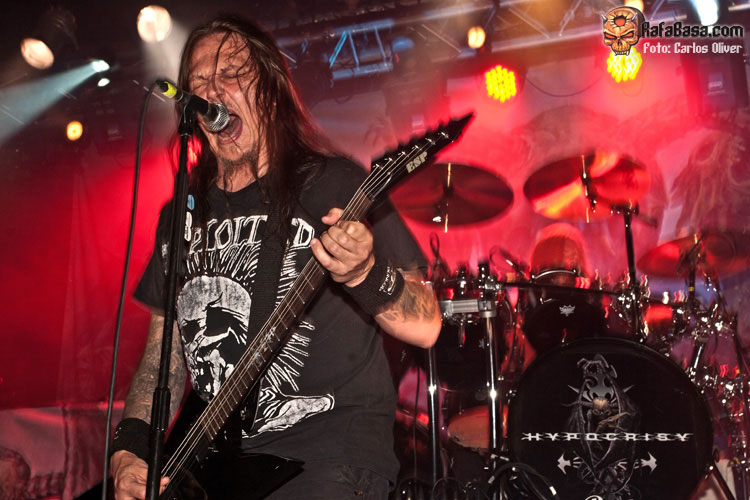 Tras el fantástico preludio que supuso la descarga de HATESPHERE, por fin llegaba el turno de las estrellas de la noche HYPOCRISY. Frente a una sala que finalmente registró unas tres cuartas partes de entrada, y ante un escenario presidido por una gran tarima central sobre la que descansaba la batería del mítico Horgh; alrededor de las 21:15 horas se apagaban las luces para dejar paso a una introducción intrigante y épica tras la que salieron a escena Tägtgren y sus muchachos dispuestos a golpearnos sin piedad con el corte que abre y titula su último trabajo "End Of Disclosure", una pieza quizás excesivamente melódica para abrir la velada pero que en directo cumplió su cometido, metiéndonos de lleno en el show gracias a su infeccioso y dinámico estribillo. Rápidamente, y sin mediar presentación alguna, (durante la velada fueron contadas las ocasiones en las que el líder de la banda se dirigió al público), la siguiente pieza en sonar fue otra composición de nuevo cuño la furiosa "Tales Of Thy Spineless", con la que el cuarteto dejaba clara la confianza depositada en su nuevo material, una confianza que quedó plenamente certificada con la sonora ovación que la audiencia tributó a esta arrolladora dupla inicial.