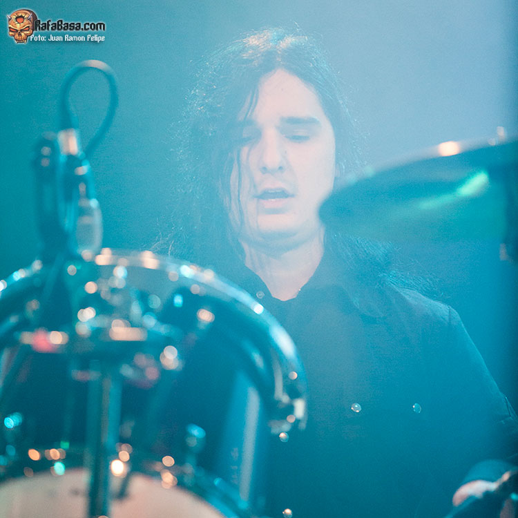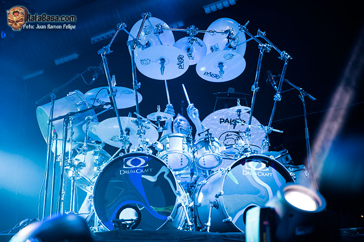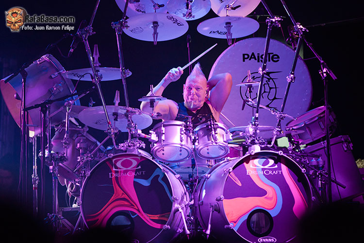 Pero el primero en salir a escena sería un batería de los más legendarios y espectaculares que tenemos en nuestro escena. Mike Terrana se acercó modestamente a su posición a un lado del escenario para comenzar la descarga. Una ubicación no habitual para su instrumento, habitualmente al fondo de la tarima. Algo que en su caso me parece totalmente justificado, ya que es una manera de apreciar mucho mejor su forma de tocar y el espectáculo que brinda con sus constantes juegos de malabares con las baquetas.