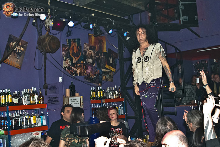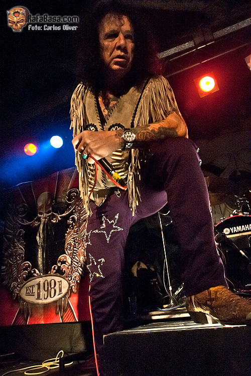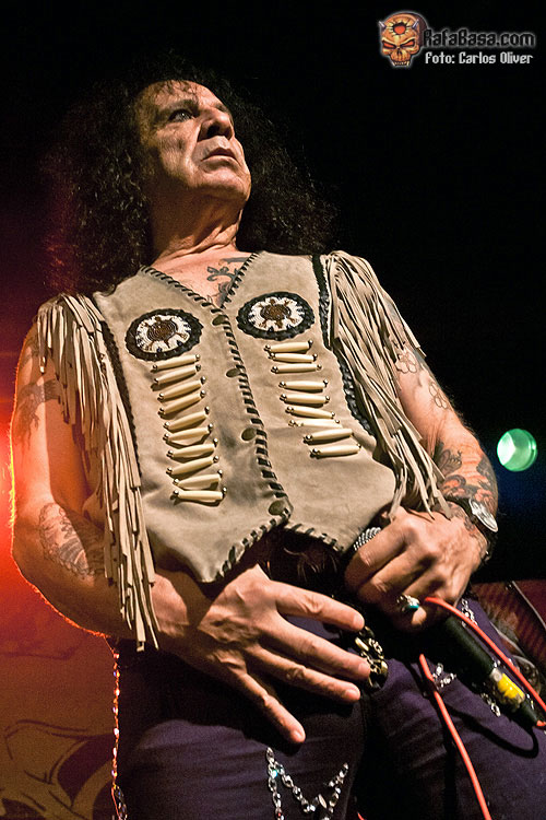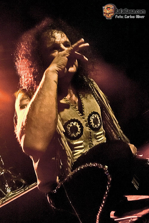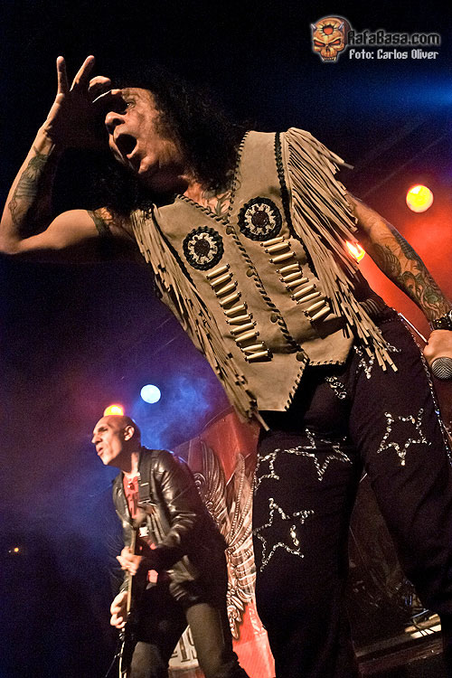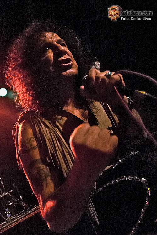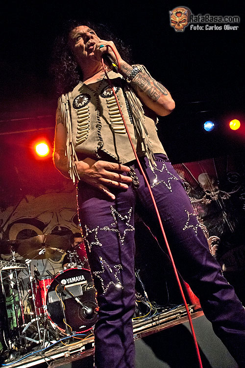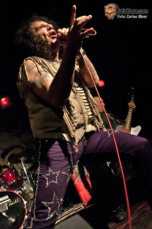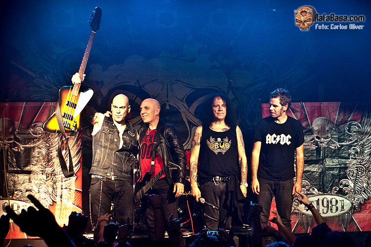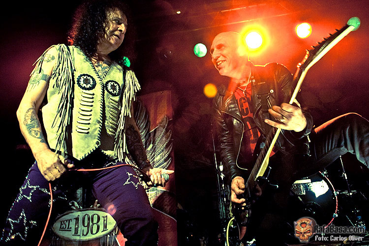 Una vez más, la banda volvía a repetir el montaje escénico de sus últimas visitas, con unos amenazantes ojos presidiendo el escenario, y dos lonas laterales que nos recordaban que la banda está en activo desde el año 1981. Con algo de retraso sobre el horario previsto, y sin la participación de ninguna banda telonera que calentara el ambiente, el cuarteto del foro salía a escena dispuesto a romper con todo, arrollándonos de entrada con el tema que servía de apertura para su última obra de estudio, un rotundo «Corre Mamón», con Paco liderando a sus compañeros hasta la entrada estelar de Fortu quien, ataviado en esta ocasión con un chaleco de flecos y unos llamativos pantalones, se convirtió en el auténtico protagonista de la velada, tirando de carisma y tablas para conectar con un público que no paró de apoyar y cantar desde los primeros compases del show. Aunque lo cierto es que durante estos primeros instantes el sonido no fue todo lo nítido que nos hubiera gustado, con constantes problemas en el micro del vocalista, poco pareció importar esto a unos fans realmente entregados, que acompañaron con auténtica devoción temas como «Más Que Un Dios», que nos dejó la estampa de un Fortu desafiante paseándose por el escenario, provocando con la mirada a las primeras filas mientras explotaba al máximo la chulería y la socarronería a la que nos tiene acostumbrados.