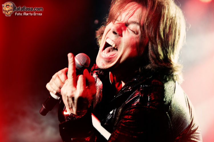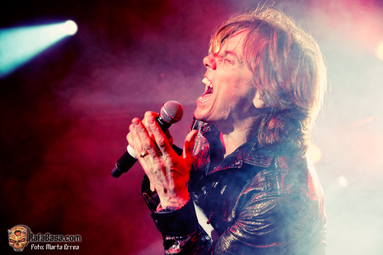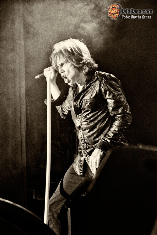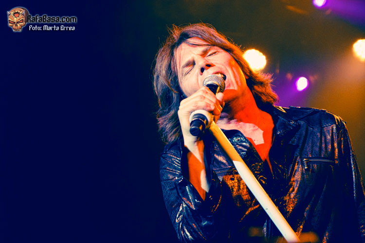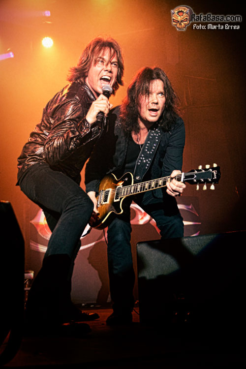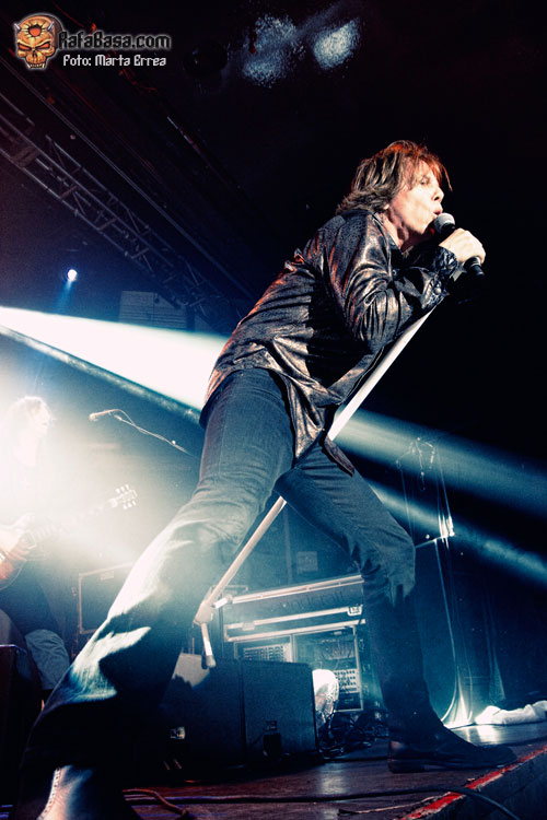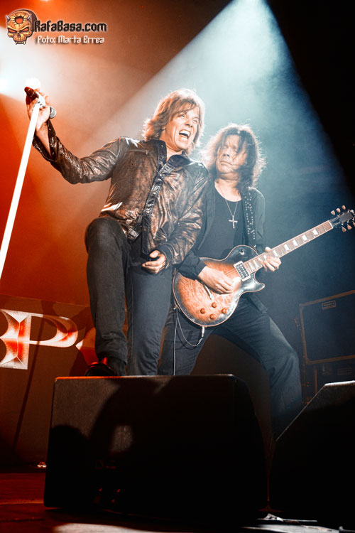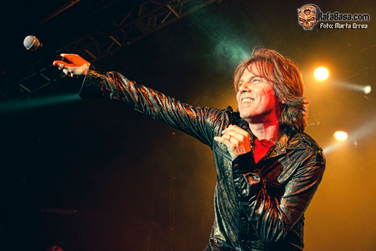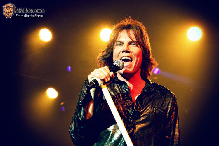 Y poco después de las 9 de la noche aparecía la banda principal sobre el escenario, un tanto diáfano sólo con dos telones laterales con el nombre de la banda partido (EUR-OPE), la batería de Ian Haughlan en medio, el gran set de teclado de Mic Micaeli ocupando casi toda la parte derecha, el estático y hierático Jon Levén (bajista) ocupando la pequeña parte libre de ese lado del escenario, y dejando en la izquierda al gran John Norum («el hombre con el toque de oro en sus manos» como siempre le presenta su amigo Joey Tempest… y compañero desde los 15 años cuando formaron juntos el embrión de EUROPE, «Force»). Por cierto, moviéndose más que otras veces y más participativo aunque sin salirse demasiado de su lugar, como siempre ha sido habitual en él. El vocalista, lógico protagonista, muy activo, conectando siempre con el respetable incluso hablando en un correcto castellano (con frases preparadas, vale… aunque genial el puntazo de comentar que «ya hemos tocado cuatro veces en esta misma sala… con las mismas jodidas palmeras», jeje), y cumpliendo de sobra como cantante y frontman, como siempre ha hecho, aunque es inevitable que poco a poco vaya algo más justo de voz, que los años pasan para todos. Eso sí, cada vez que hace sus habituales malabarismos marca de la casa con su pie de micro blanco es inevitable sonreír y recordar tiempos pasados, vídeos y demás.