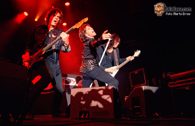 Comenzaron puntuales a ritmo de sus dos cortes habituales para comenzar en sus últimos tiempos, «Riches to rag» y «Firebox», que vale… son dos de sus temas populares de su última época pero que nos siguen dejando fríos para empezar (sobre todo la segunda), tanto a los viejos como a los nuevos fans, y más a los que sólo conocían los hits, sorprendidos por el toque tan duro del sonido base de la banda en la actualidad (variedad de público obvia, y en general de 30 para arriba). Mucha mejor recepción tanto con «Superstitious», uno de los clásicos imprescindibles desde su «Out of this world», y esa cañera «Scream of anger» que, aún sonando muy actualizada, es espectacular. Menos me gusta esa misma actualización sonora de «Girl from Lebanon», única mirada a su «Prisoners in Paradise» si no recuerdo mal, su disco «raro» (pero muy bueno) ya en los albores del rock alternativo y poniendo fin a la gloriosa primera etapa de la banda. De los temas de sus últimos cuatro discos (tras la reunión), ya digo que algunos me gustan más y otros menos, y curiosamente «No Stone unturned» me deja muy frío mientras que la balada/medio tiempo «New love in town» me parece de los más interesantes, ya con Tempest portando su acústica en primera línea.