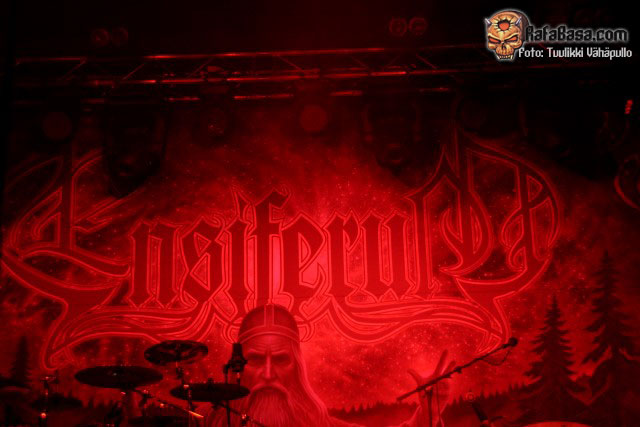 Hubo que esperar un poquito para que ENSIFERUM tuviera listo el escenario a su gusto, durante la espera mi colega Sampo me informo de que esa noche y en un futuro cercano, Petri solo se dedicaría a cantar, un problema físico le impide tocar la guitarra con comodidad, así que tendríamos al antiguo bajista y guitarrista Jukka-Pekka Miettinen tocando la guitarra en su lugar, aunque hemos de recordar que ya ha sustituido a otros miembros temporalmente, así que nada nuevo ni importante, por mi perfecto, a ver si así conseguíamos ver a un Petri un poco más activo que habitualmente.