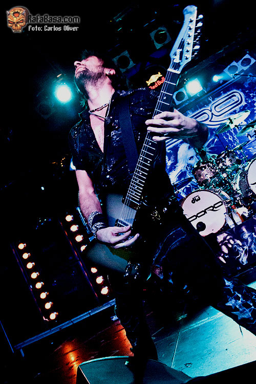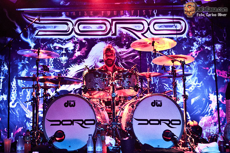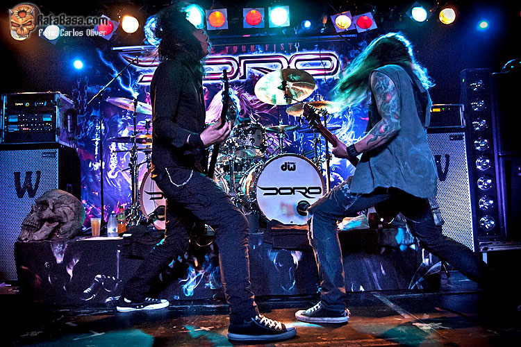 Con el escenario sumido en la más absoluta oscuridad empezaba a sonar a través del P.A. la introducción que nos adentraba en la intensa y vibrante «Night Of the Warlock», única pieza rescatada de su «Fear No Evil» de 2009 y que significó la primera concesión a su material en solitario, mostrándonos a una sala enloquecida acompañando su característica melodía ante la cara de satisfacción y felicidad de una agradecida DORO. Pese a que indudablemente la vocalista fue la protagonista absoluta de la velada, muy destacable me pareció la participación del resto de sus compañeros, especialmente el del tándem formado por Bas Mass y Luca Princiotta, quienes firmaron una actuación realmente notable, repartiéndose los solos de los temas e imprimiendo una fuerza y garra descomunal a clásicos del calibre de la primeriza «Metal Racer».