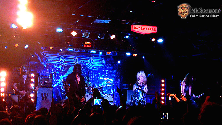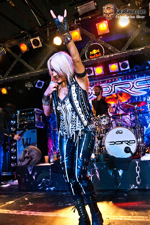 Sintiendo el apoyo incondicional de sus seguidores y sin concedernos un segundo de tregua, el ambiente continuo caldeándose al reconocer la entregada audiencia los primeros compases de «Earthshaker Rock», que nos dejaba la imagen de Doro descendiendo hasta el foso para ceder el micrófono a los fans de las primeras filas. Tras una fantástica e incontestable dupla inicial, en la que Doro puso, literalmente, la sala patas arriba, llegaba el momento de los saludos y los agradecimientos, mezclando inglés, castellano y catalán para completar la presentación de un atronador «Burning Witches», que se convertiría en el preámbulo perfecto para la rotunda declaración de intenciones que representa «Fight For Rock», que lograba, aún más, caldear el ambiente, alcanzándose tal nivel de decibelios que hacia prácticamente inaudible la voz de Doro a la hora de atacar los estribillos.