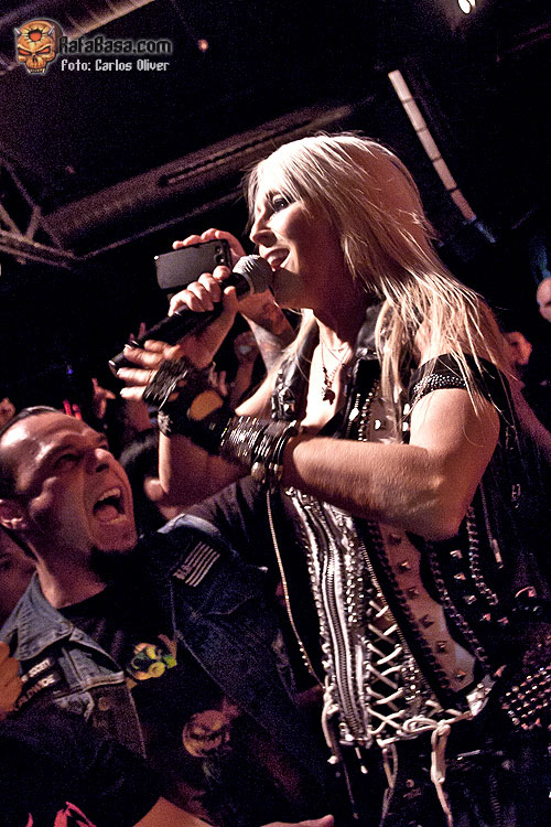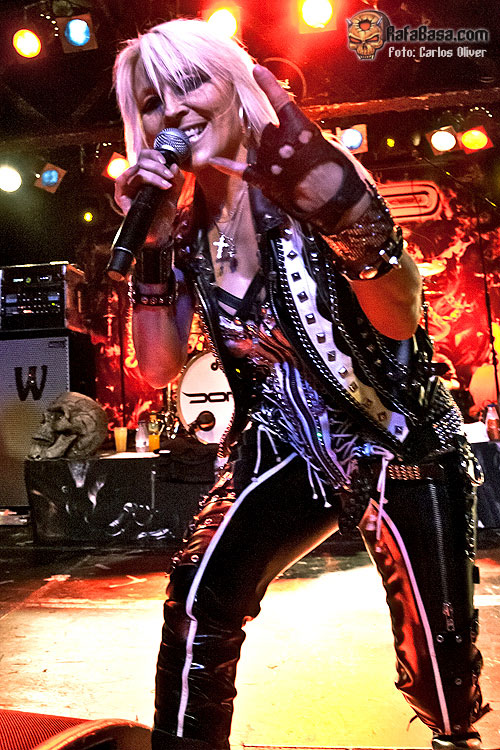Tras recuperar el aliento, el show seguía adelante de forma eléctrica y arrolladora con una de las piezas más vibrantes de la noche «Burn It Up», que volvía a recuperar el entusiasmo y la euforia entre los asistentes, haciéndonos nuevamente cantar mientras las primeras filas no dejaban de saltar. De hecho durante toda la actuación fueron constantes las muestras de apoyo y cariño que recibió la carismática vocalista, obligándole a interrumpir, en un par de ocasiones, las presentaciones de temas como el mítico «East Meets West», que nos dejó la imagen de un entregadísimo Bas Maas exprimiendo al máximo su guitarra, mientras arrodillado rendía pleitesía a la figura de su «jefa». Pese a que en ningún momento la intensidad del show decayó, también tuvimos tiempo para momentos algo menos explosivos como el clásico de WARLOCK «Out Of control», que fue el elegido para albergar el brutal solo de batería Johnny Dee, que si bien esta vez no nos deleitó con ninguno de sus números acrobáticos, sí que nos hizo cantar la melodía del popular «I Love It Loud» de KISS.