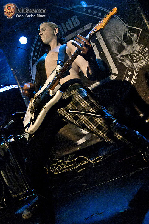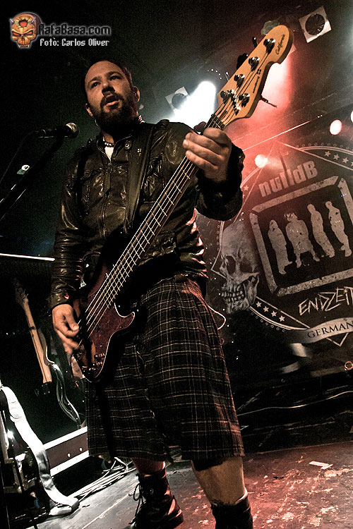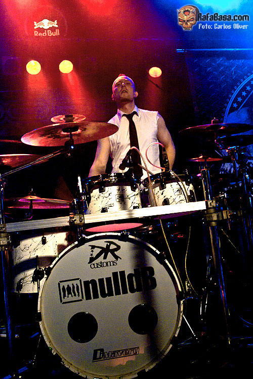 Seguramente lo más destacable de la presentación de NULL DB fue la llamativa apariencia de su guitarrista, Mischa Matveev, quien salió a escena con el torso descubierto y pintado de blanco y negro, luciendo un «look» que recordaba a los que suele utilizar Wes Borland de LIMP BIZKIT. Musicalmente hablando la propuesta del cuarteto alemán se basa en un metal potente y vanguardista, con algunas pinceladas industriales, y en el que conviven las melodías volátiles y atmosféricas junto a unos riffs más densos y agresivos, además de contar con la particularidad de cantar en su lengua materna, el alemán. Precedidos de una presentación, llamémosle peculiar, con tres personajes disfrazados de raperos anunciando su entrada, el cuarteto asaltaba el escenario del Razzmatazz con la pieza que abre su último trabajo «Tyrannei», un trallazo directo y avasallador que les servía para romper el hielo y presentarse ante una audiencia expectante y curiosa. Siguiendo con el material contenido en «Endzeit», la siguiente en hacer acto de presencia fue la pieza que presta su nombre al plástico, en la que la banda alemana se mostró algo más densa y cadenciosa, apostando por unos desarrollos más complejos y unas guitarras con más "grovee" y machaconas.