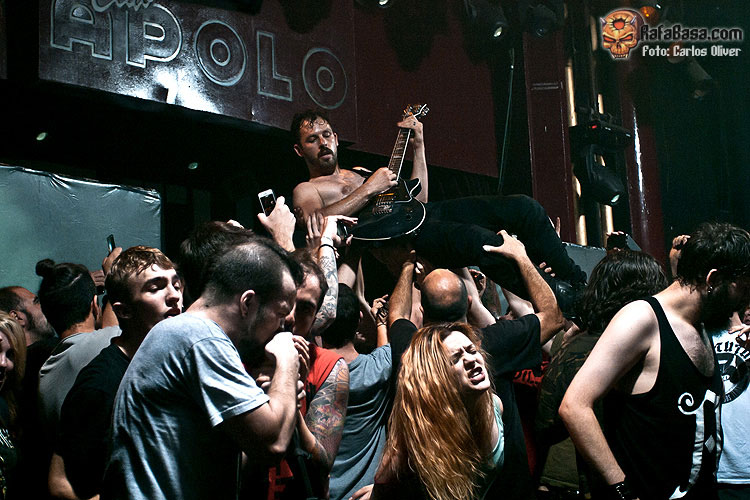 Como viene siendo habitual, a una hora muy temprana, las 19:40, arrancaba la actuación de los encargados de abrir fuego en esta intensa velada, los franceses Hypno5e. Pocas referencias tenía de este cuarteto de Montpellier, que se presentaba ante un Apolo todavía despoblado y un tanto frío para ofrecernos una buena muestra del material incluido en su último trabajo "Acid Mist Tomorrow". Pese al desconocimiento generalizado de la audiencia, lo cierto es que los galos se marcaron un show corto pero intenso, dejando una magnífica impresión con su metal heterogéneo y lleno de pasajes experimentales, adentrándonos en unas sonoridades llenas de texturas y matices.