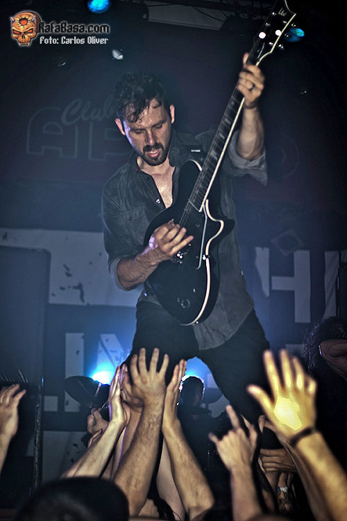 Muchos y constantes fueron los «circles-pits» y los «pogos» que se sucedieron esta noche en la pista del Apolo. Así que ni tan siquiera al encarar la banda su tema más novedoso «Hapiness Is A Smile», la audiencia se concedió un segundo de tregua. La vuelta sobre su último trabajo «One Of Us Is The Killer», estaría marcada por la demoledora «Understanding Decay», en la que la base rítmica formada por la dupla Wilson/Rymer creó una infranqueable pared sonora sobre la que treparían los incisivos riffs de Weinman y Love. Como si de un salto en el tiempo se tratase, y creando un vínculo imaginario entre el presente y el pasado de la banda, la siguiente en sonar fue la delirante «43% Burnt», que significaba la primera pieza rescatada de su debut de 1999 «Calculating Infinity».
