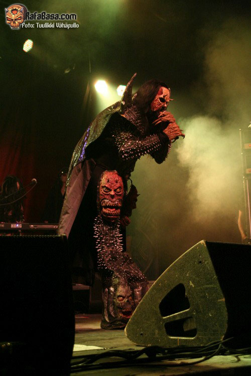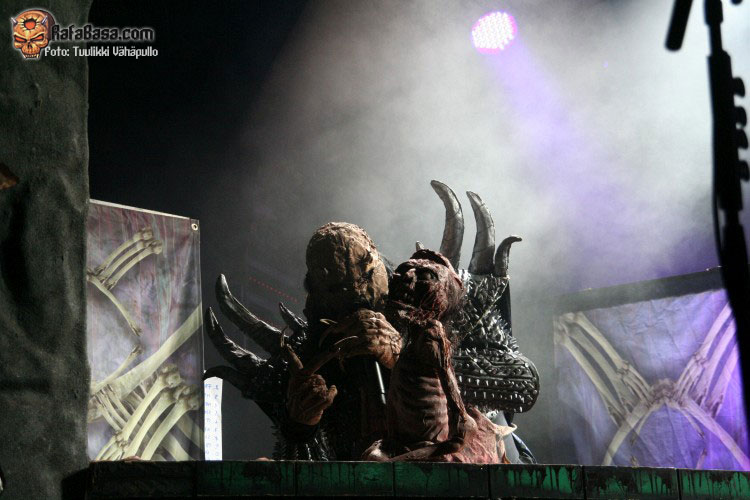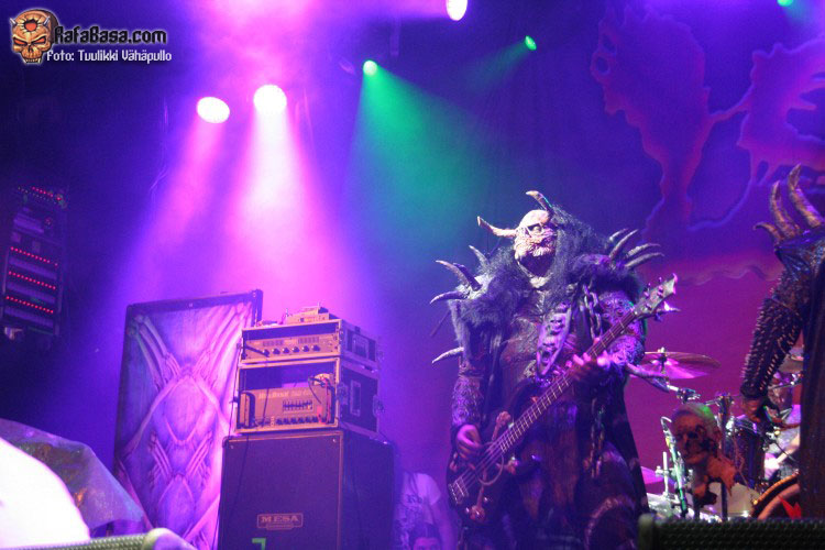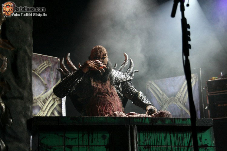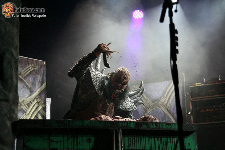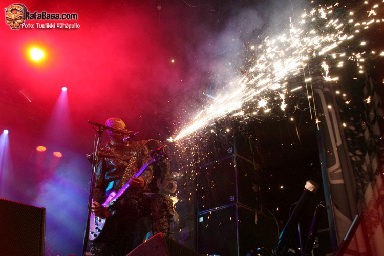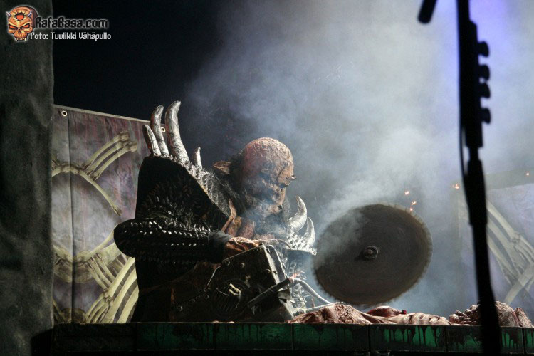 Como fiesta de presentación del nuevo disco que era, volvieron tras la intro del mismo, «SCG7: Arm your doors and cross check» a ritmo del tema homónimo, «Scare force one», sin poder hacerme una verdadera opinión sobre este tema hasta que lo escuche más a fondo, todo lo contrario que el bastante más pegadizo «How to slice a whore», donde Mr Lordi ataviado cuan Leatherface (el malo de «La matanza de Texas» para despistados), delantal y mascara incluidos nos dios una lección de anatomía cárnica a base de sierra radial. Como ya he dicho varias veces, puro espectáculo, puede que musicalmente no sean nada del otro mundo para muchos, pero en el aspecto visual no creo que dejen indiferente a nadie.