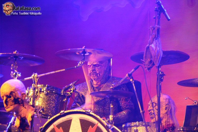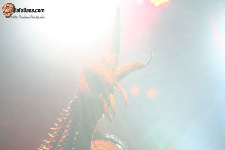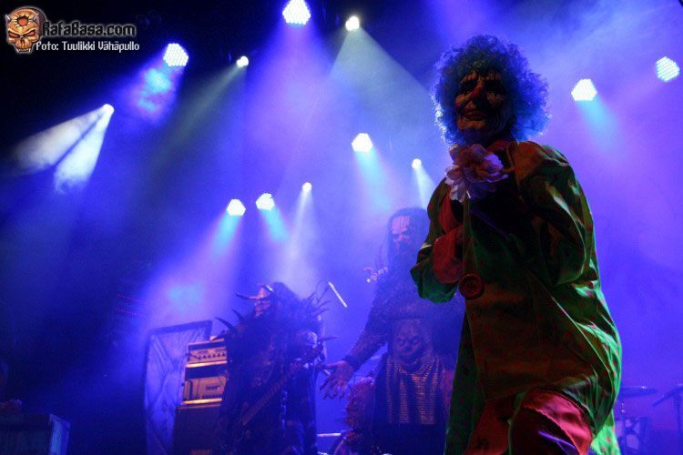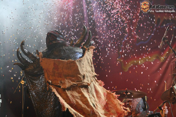 Unos de los momentos álgidos de la noche llegaría como no a ritmo de «Blood red sandman», tema que todos nos sabíamos de memoria y durante la cual Mr Lordi se paseaba por el escenario con su gorro de dormir y saquito de sueños lleno de confeti, a la vez que la pirotecnia y cañones de serpentina entraban en acción. Hacía mucho tiempo que no veía este tipo de cosas en una sala. Melodías circenses comenzaron a sonar con «Hell sent in the clowns», un tema más pesado de lo habitual, tétrico y que no hará mucha gracia en directo a quienes tengan fobia por los payasos, pues dos se pasearon por el escenario con cara de pocos amigos.