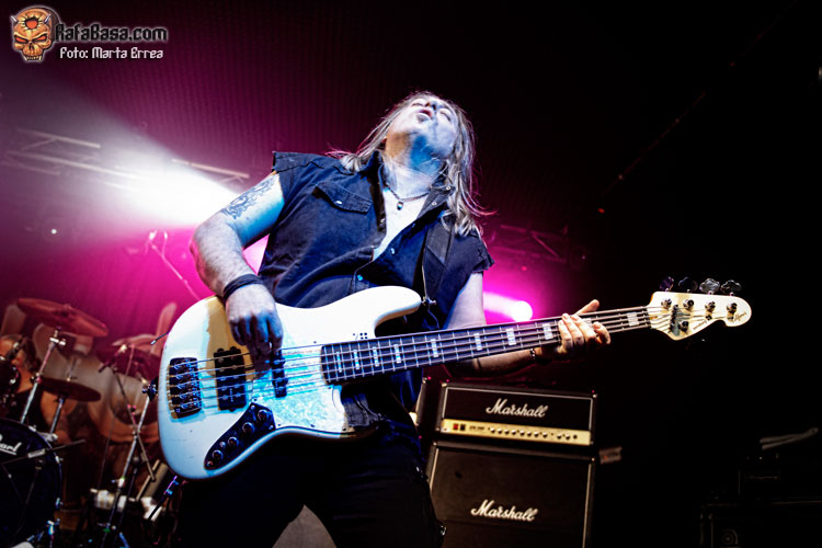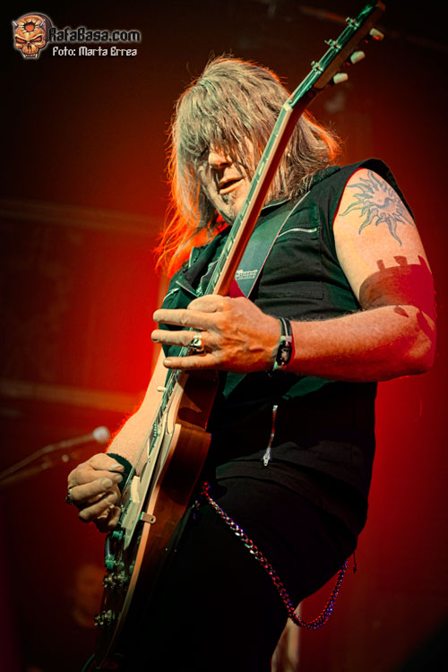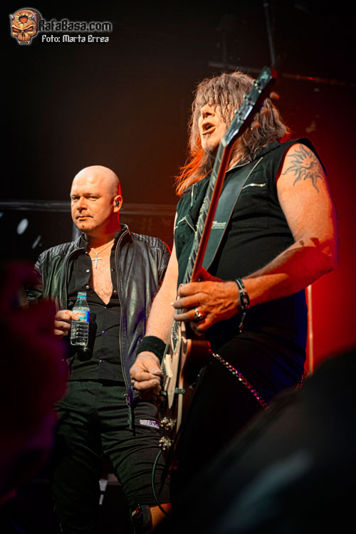 Michael Kiske estuvo muy bien de voz, llegando a casi todos los exigentes tonos que se le requerían. Lucía un aparatoso aparato ortopédico en su rodilla izquierda debido a la lesión que tuvo hace unas semanas, además de tener que hacer uso esporádico de una banqueta para descansar la articulación dañada. El otro foco de todas las miradas era Kai Hansen, luciendo un look capilar (me niego a llamarlo peinado) cada vez más extravagante y -¿por qué no decirlo?- ridículo, como si quisiera asemejarse al personaje de Daryl de The Walking Dead con ese amago de flequillo. Aunque en lo importante, que es el aspecto musical, Kai estuvo genial con su guitarra y a los coros, animando al personal con su simpar simpatía. Me gustó mucho Mandy, tocando con una clase sensacional, pese a quedar en un segundo plano frente a sus compañeros. El bajista, compositor y principal mecenas Dennis Ward también se quedó un poco a la sombra, pero controlando todo desde su esquina y aportando su voz a los coros, formando además una sólida base rítmica junto al batería Kosta.