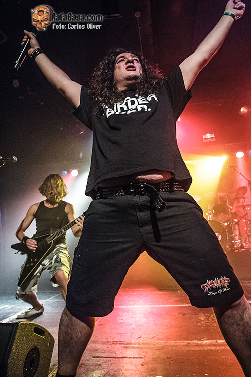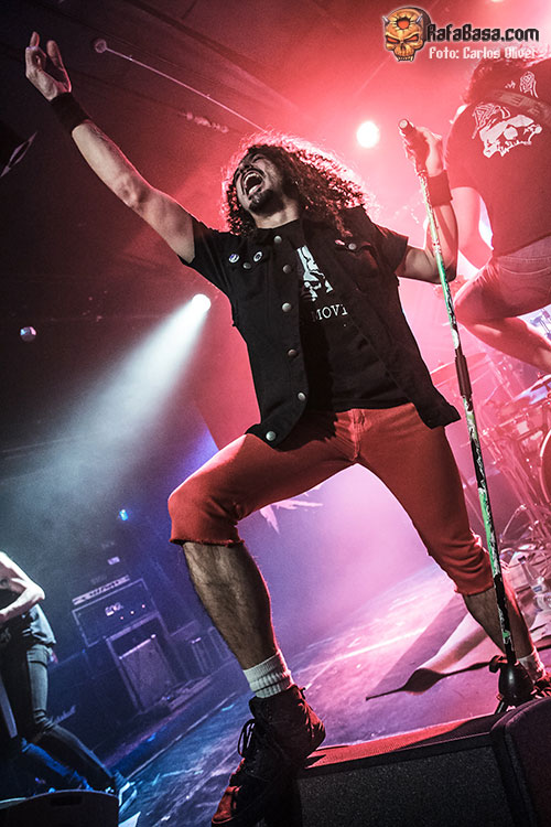 Como viene siendo habitual en todas sus descargas la formación catalana salió a escena con el cuchillo entre los dientes y dispuesta a hacernos pasar un buen rato. Sin duda el hecho de tocar en casa y que entre el público hubiera muchas caras conocidas y amigos hizo que el quinteto se sintiera muy a gusto sobre las tablas. Para dar el pistoletazo de salida al show optaron por una de las piezas más conocidas de su debut «Ultra Thrash», todo un puñetazo sonoro en forma de carta de presentación con la que la banda mostraba sus credenciales. Muy motivados y activos sobre las tablas, Busi y Requena fueron los encargados de dar mordiente y pegada a piezas como «I.Y.F.F.», mientras Juli se aferraba a su pie de micro para liderar las poderosas acometidas de sus compañeros, espoleando al máximo al respetable para provocar los primeros «circle-pits» de la noche.