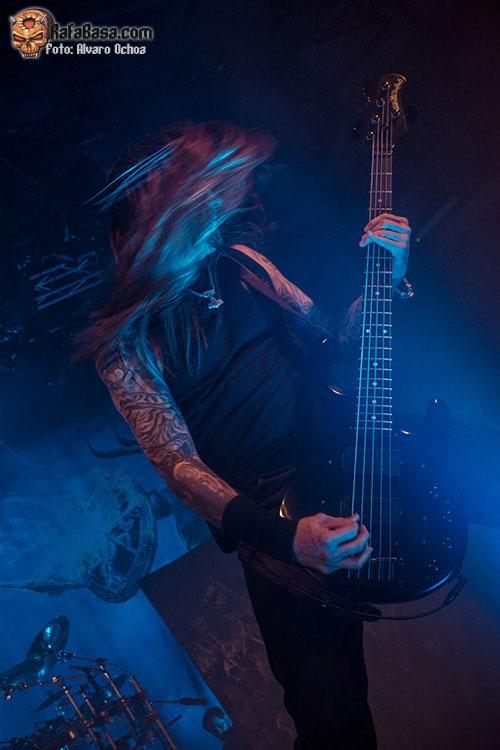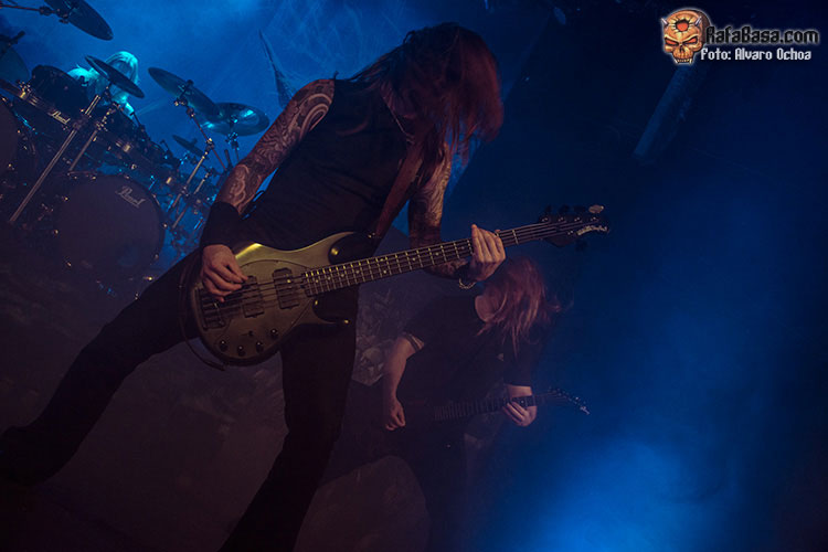 Varias fueron las ocasiones en las que la audiencia coreó el nombre de la banda, así que Johan Hegg no tuvo más remedio que alzar su cuerno al aire para brindar con todos los presentes antes del arranque de otra de sus piezas más aclamadas "As Loke Falls", que nos sumergía en esas ambientaciones oscuras y pesadumbrosas, acompañadas de las tonalidades verdosas que cubrieron el escenario. El recuerdo a la primera época de la formación llegaría con los aires más death metaleros contenidos en la épica "Bleed For Ancients Gods", con el escenario, en esta ocasión, teñido en tonos púrpura y durante la que Olavi Mikkonen nos dejó un incendiario desarrollo solista. El momento de aunar nuevamente nuestras gargantas llegaría con los hímnicos estribillos contenidos en "Death In Fire", con Hegg paseándose victorioso por el escenario.